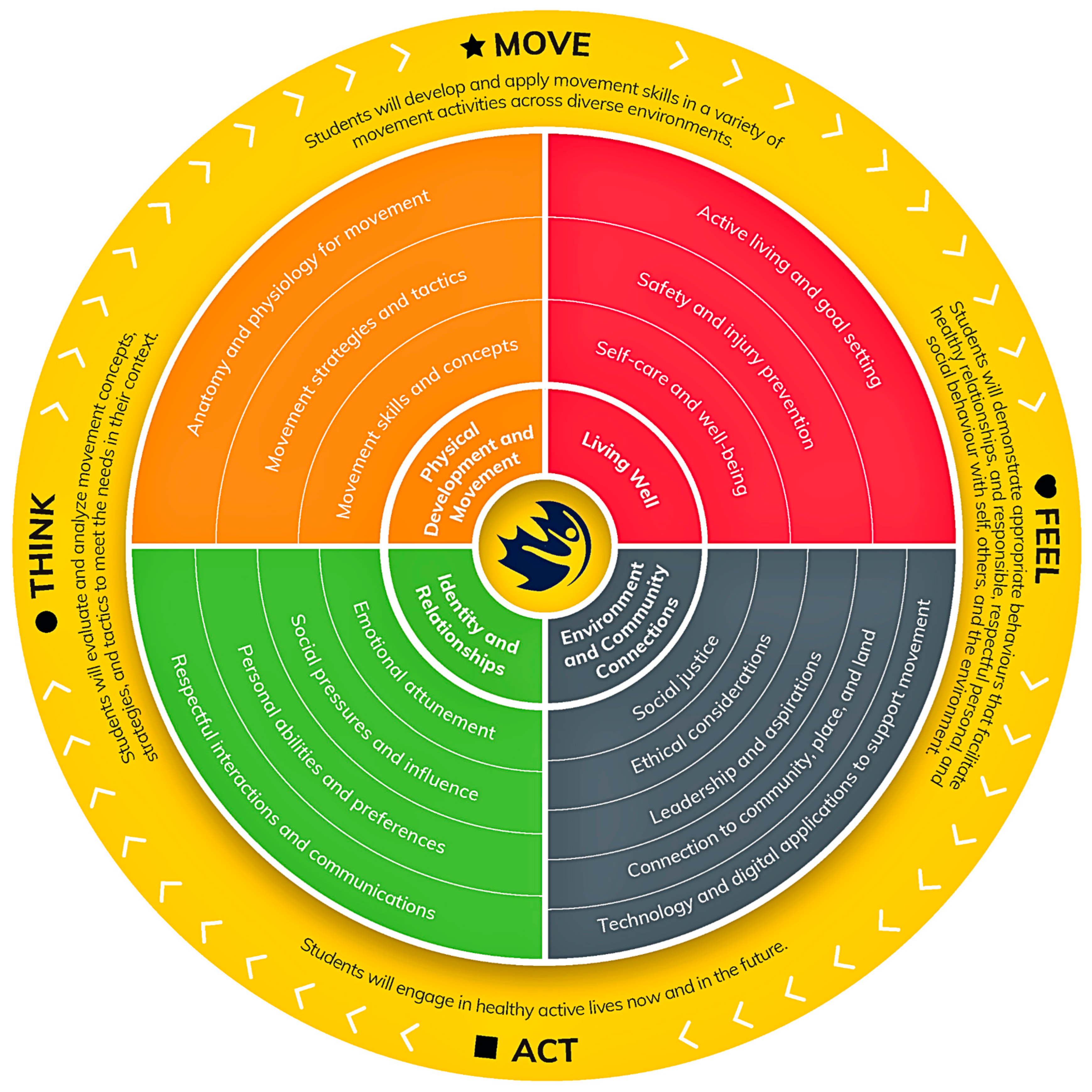 British Columbia (and Yukon), Physical and Health EducationCurriculum Competencies: physical literacy; healthy and active living; school and community health; mental well-being