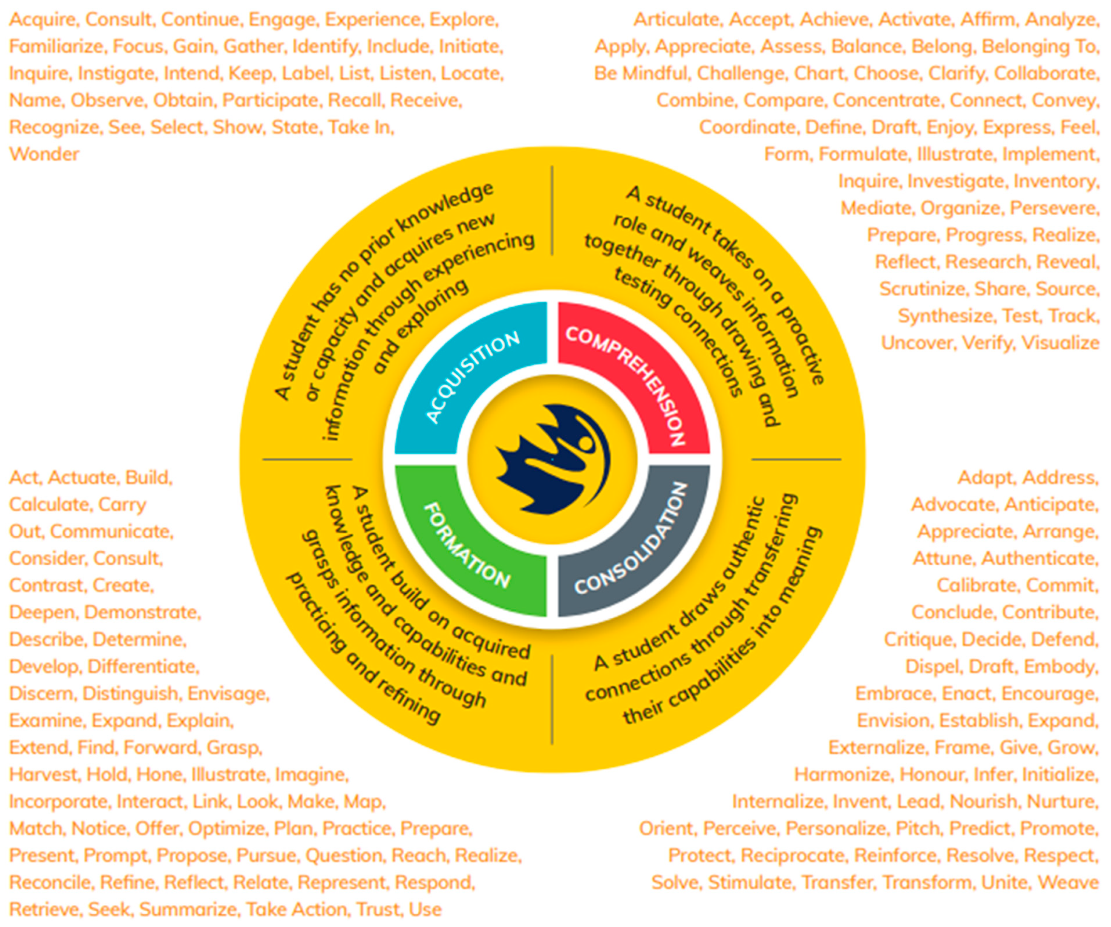 The Wholistic Verb Wheel (Davis et al., 2023, p. 19; Figure 2) includes four interconnected stages—Acquisition, Formation, Comprehension, and Consolidation—serving as a dynamic compass for strength-based QPE instruction and assessment to a “multiple points of entry” approach. Each stage contains specific verbs (Figure 3) that align with different learning phases (e.g., age-and-stage) while honouring diverse ways of demonstrating knowledge and understanding.