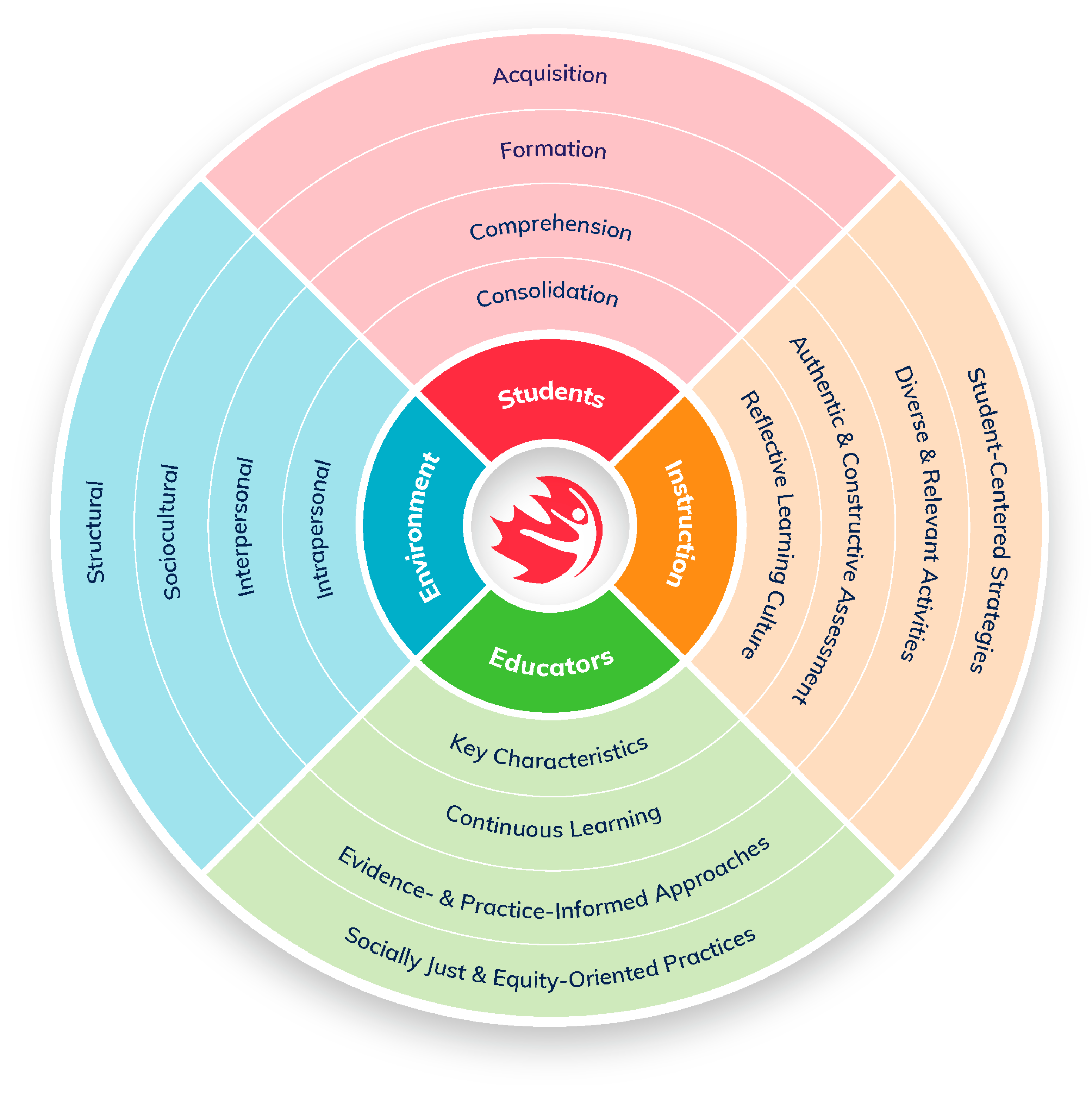 • The “Student” section and the four sub-components reflect the four stages of learning from the Wholistic Verb Wheel (Figure 2)—Acquisition, Formation, Comprehension, and Consolidation. These four interconnect stages focus on a continuous and wholistic approach to learning which can serve as a dynamic compass for PE educators when implementing strength-based instruction and assessment. For example, the four stages honour and prioritize learning processes and skill development over the final destination or outcome. In QPE settings, educators are not assessing the results; they are assessing the process, providing instruction (e.g., cues) along the way and modifying their instruction (e.g., cues) as necessary so the student’s process is done correctly which then leads to the correct result. Learning is not linear. And, as students encounter new or familiar movement challenges and experiences, they may move fluidly between various learning stages. PE Educators can use the Students section when considering individual learning journeys and their unique contexts, as each sub-component offers specific verbs taxonomies that align with different learning phases (e.g., age-and-stage) and the diverse ways students can demonstrate knowledge and understanding, creating a “multiple points of entry” approach to instruction and assessment.