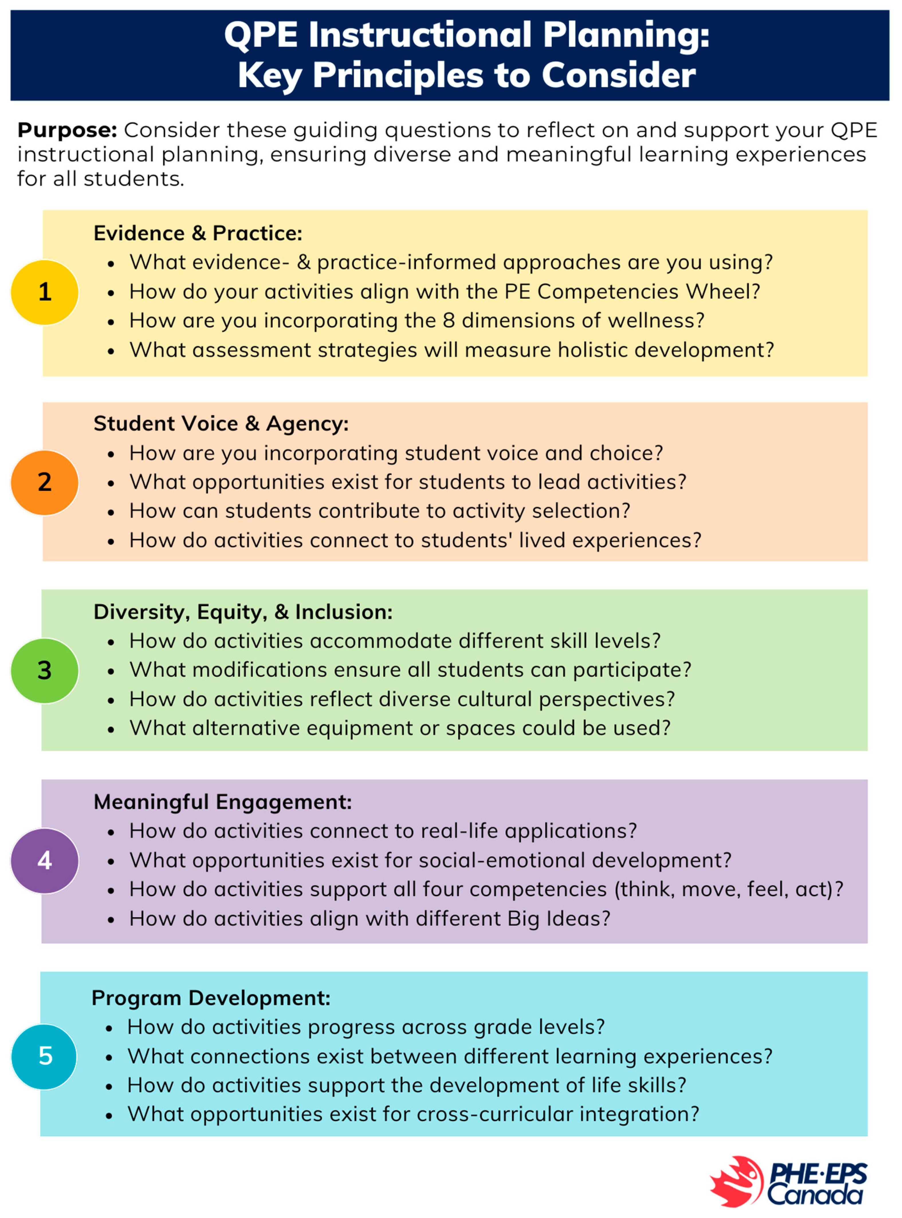 With approximately 15,500 public schools across the country, there are about 5.05 million children and youth who could significantly benefit from quality physical education (QPE) programs (Statistics Canada, 2024). QPE extends beyond simply enabling students to move freely in various situations–it challenges the traditional sport-based model of PE (Ennis, 2014), offering students a meaningful, culturally relevant, and holistic education (Davis et al., 2023). Through the emphasis of physical literacy development and incorporation of enriched pedagogical practices (Gleddie & Morgan, 2021), QPE equips young people with the essential knowledge, skills, and attitudes for prioritizing their physical, social, emotional, spiritual, cultural, and mental well-being as they transition into adulthood (Bryan & Sims, 2020; Martins et al., 2025). However, designing QPE curricula that align with shared global competencies/outcomes becomes increasingly challenging due to the absence of a national PE curriculum in Canada. To address this issue, Physical and Health Education Canada (PHE Canada) developed the Canadian Physical and Health Education Competencies (2023) which highlight core PE competencies and outcome themes intended to serve as QPE exemplars for K–12 education systems across the country.