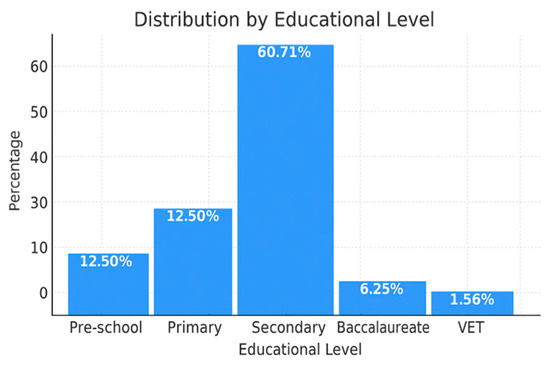 Figure 6 illustrates the educational levels at which teachers work. The predominant level of professional practice is secondary education (65.63%), followed at a distance by pre-school or primary education (12.95%). Other levels such as baccalaureate, vocational training or intermediate degrees have a reduced representation.