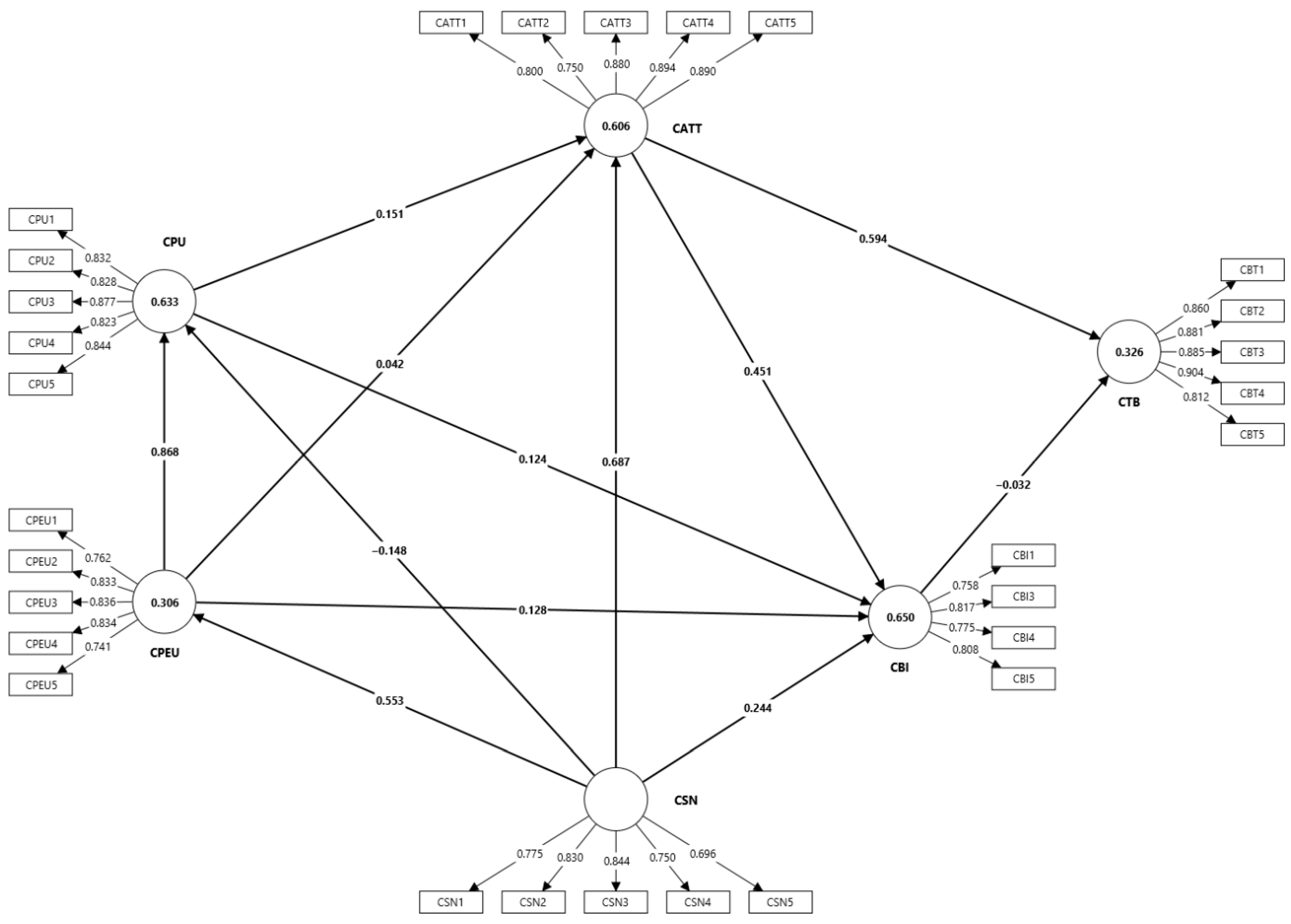 Additionally, a key methodological limitation concerns the measurement of “chatbot brand trust.” Although the construct was framed around confidence, dependability, and ethical assurance, the questionnaire did not anchor responses to a single identifiable brand. As a result, participants may have referred to different brands (e.g., ChatGPT, Gemini, MetaAI, Claude) or even multiple brands simultaneously, which introduces ambiguity in interpreting brand trust. This limitation may affect the internal validity of the construct; future studies should address this by explicitly specifying brand references or designing brand-specific instruments to ensure consistency in responses. In addition, regarding the model fitness, the SRMR values (0.081–0.083) were slightly above the strict cutoff of 0.08 but within the acceptable range of 0.10, while the NFI (0.731) fell below the ideal threshold of 0.90. These results indicate an acceptable, yet improvable model fit. Future studies should test the model with larger samples or apply CB-SEM for stronger validation.