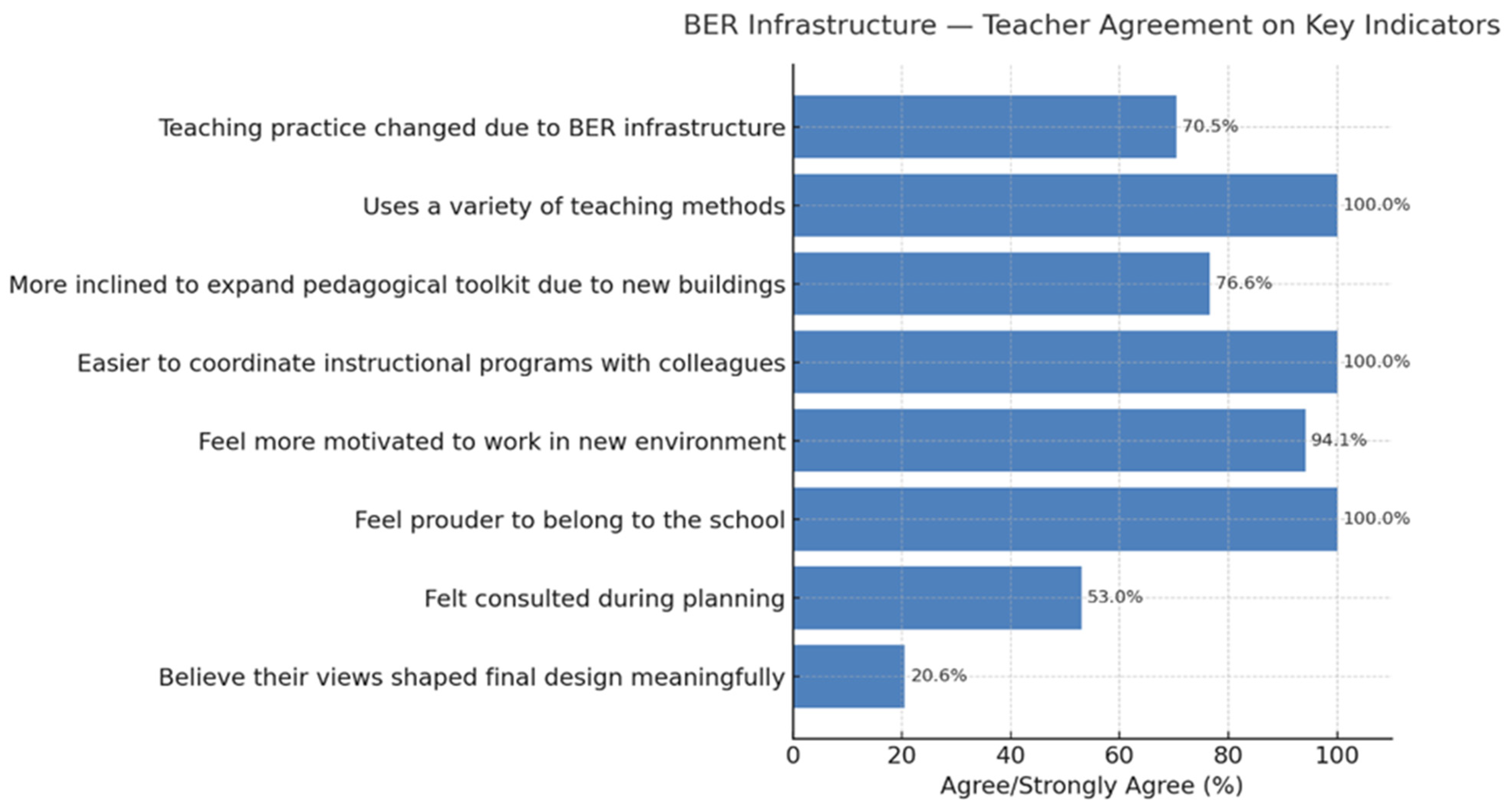 n = 34) regarding the impact of the BER infrastructure. The descriptive analysis highlights patterns that were elaborated through interviews and supported by document analysis. The highest levels of agreement were recorded for varied teaching methods (100%), ease of coordination with colleagues (100%), and increased professional pride (100%), reflecting the themes of pedagogical flexibility, collaboration, and wellbeing discussed earlier. A strong majority also reported higher motivation (94.1%) and changes in pedagogy (70.5%), consistent with teachers’ qualitative accounts of shifting practice and identity. Lower levels of agreement were observed in relation to consultation (53%) and influence on final design decisions (20.6%), which aligns with the frustrations and contradictions expressed in the focus groups and confirmed in consultation records. In summary, the quantitative data reinforce the thematic findings by demonstrating broad staff agreement on the positive pedagogical and professional impacts of the BER redevelopment, while also corroborating the qualitative evidence of tensions around design consultation and infrastructure constraints.