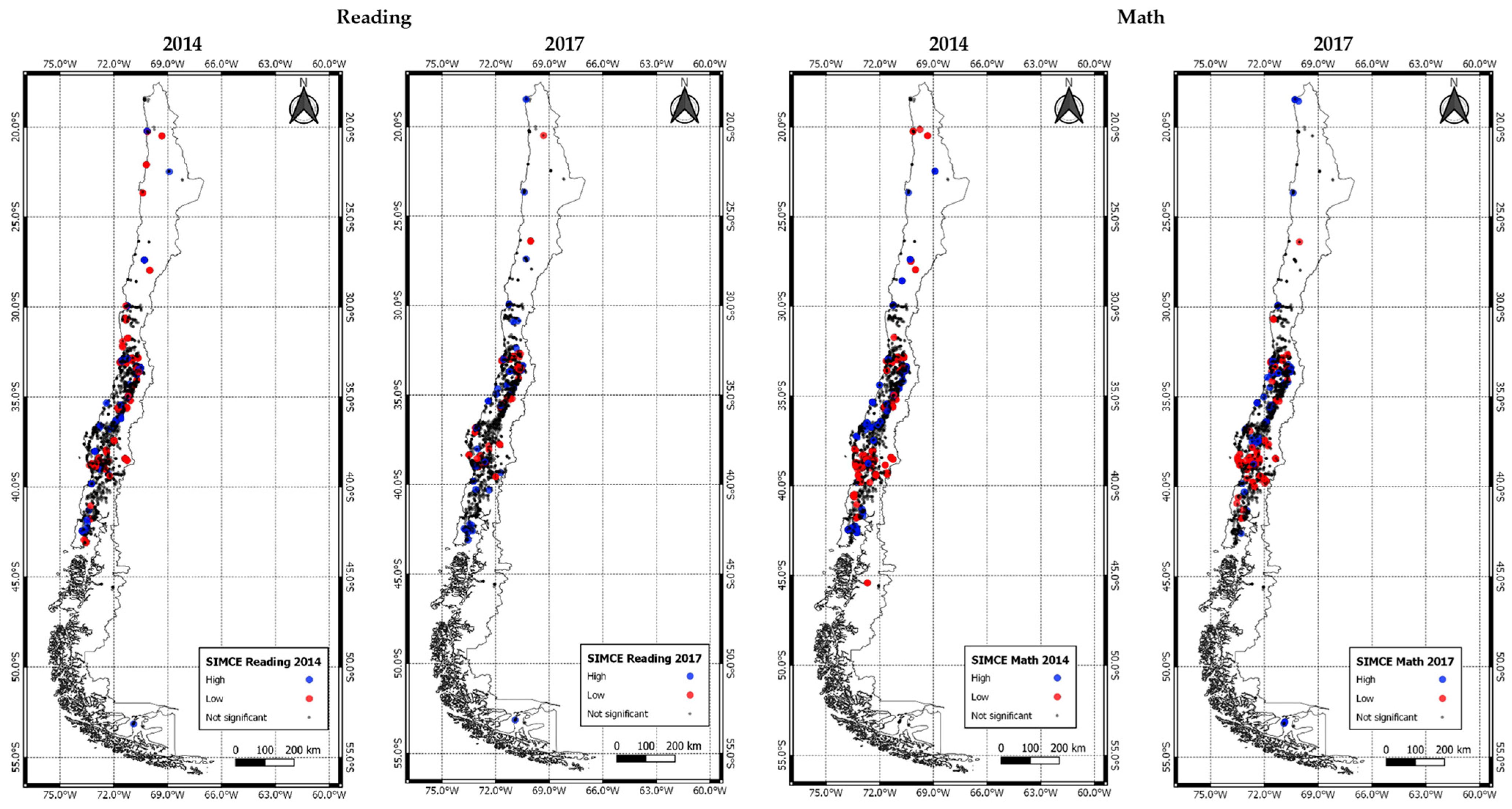 The presented results confirm the existence of associations and spatial dependence in students’ academic performance at the school level, illustrating inequalities in performance on standardized tests—namely, the Education Quality Measurement System (SIMCE) tests—across the Chilean territory. We also demonstrated that there is a spatial diffusion effect between schools, which is mainly explained by concentrations of socioeconomic groups. These results align with those reported by