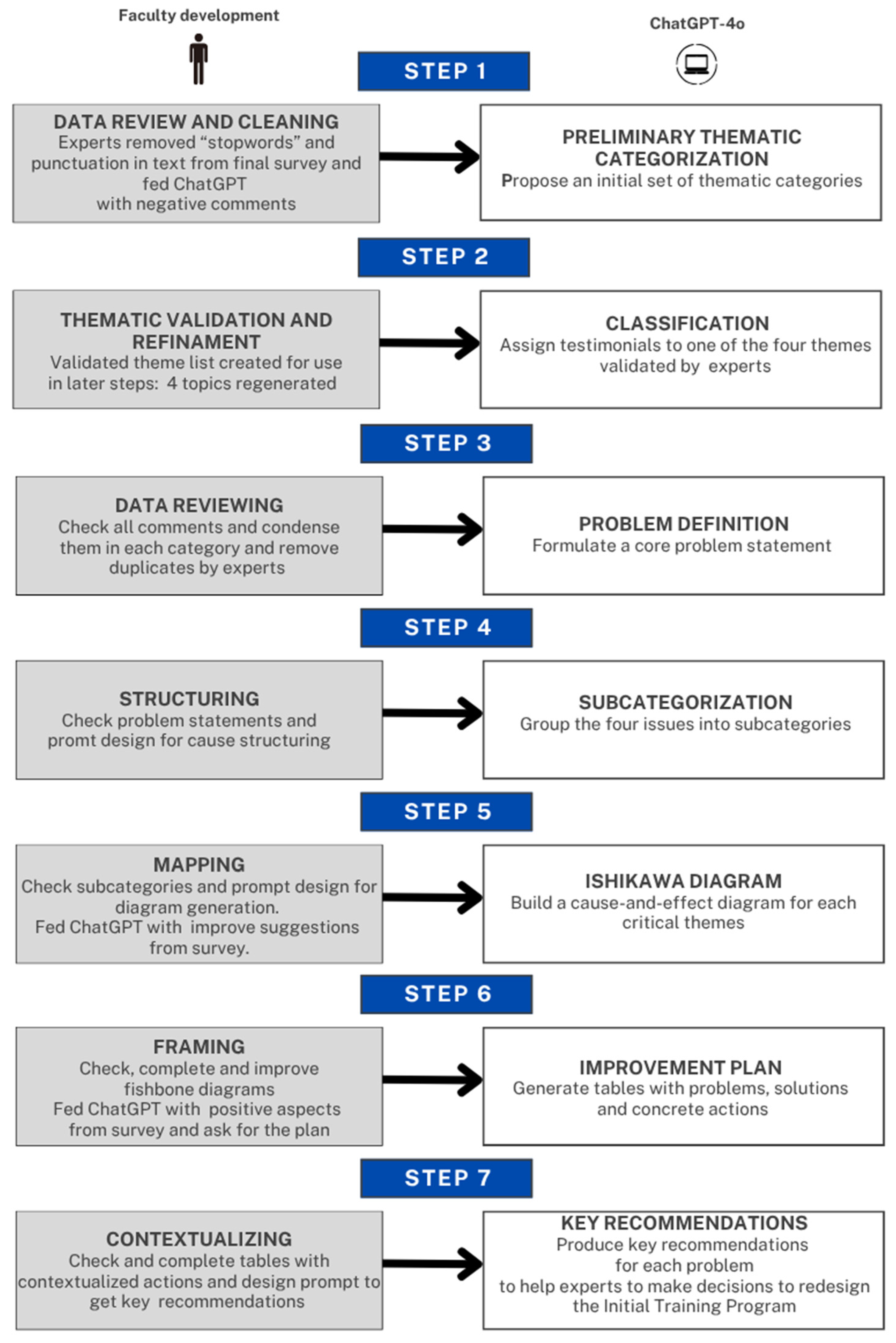 - To explore the root causes of the identified critical aspects through thematic grouping and visual organization into a cause-and-effect diagram, assisted by ChatGPT.