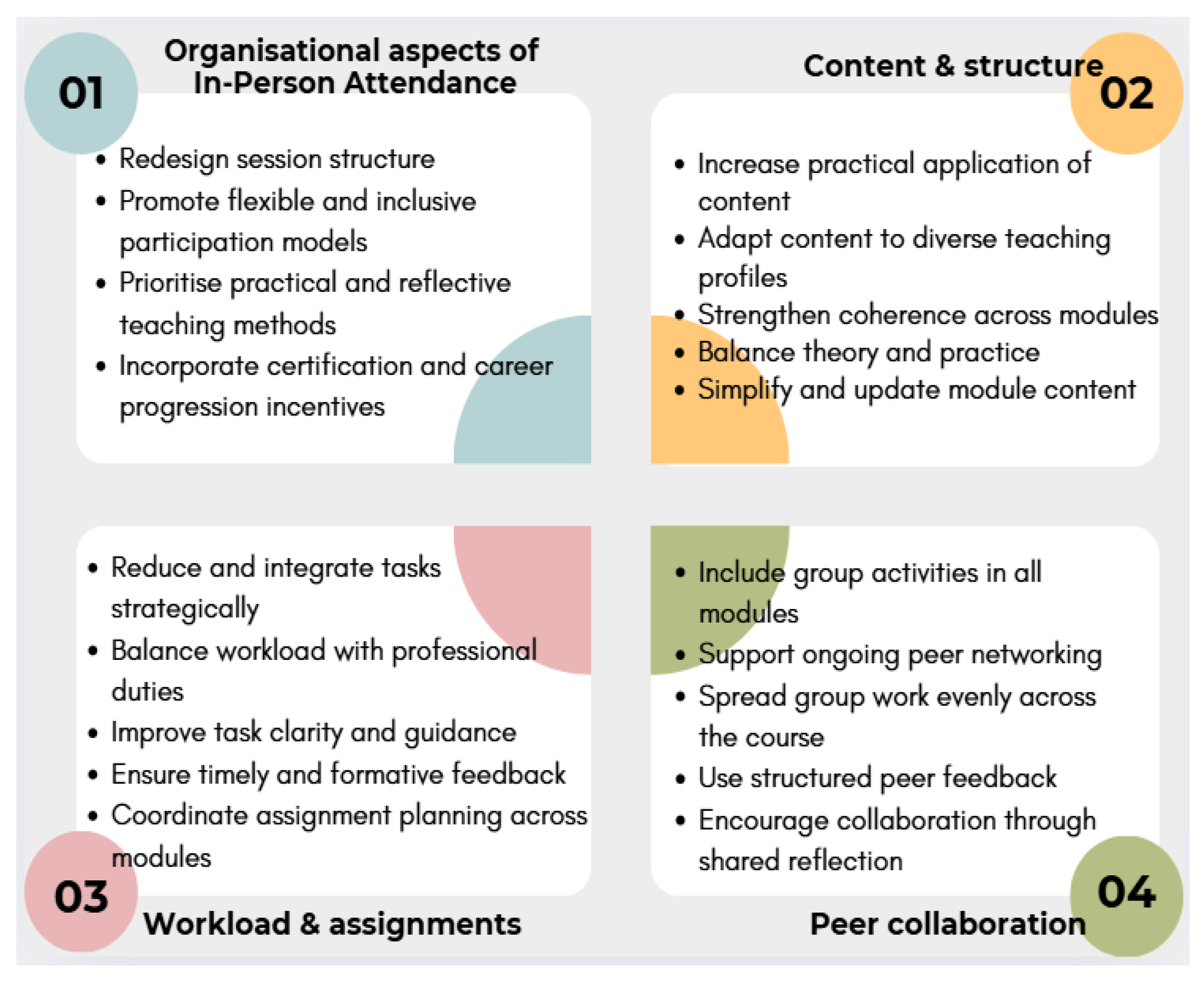 | Lack of networking tools | No platform for ongoing communication | Enable digital tools to support networking and peer interaction | Activate Moodle forums to encourage discussion among peers. Suggest professional networks such as LinkedIn for ongoing peer connection. |