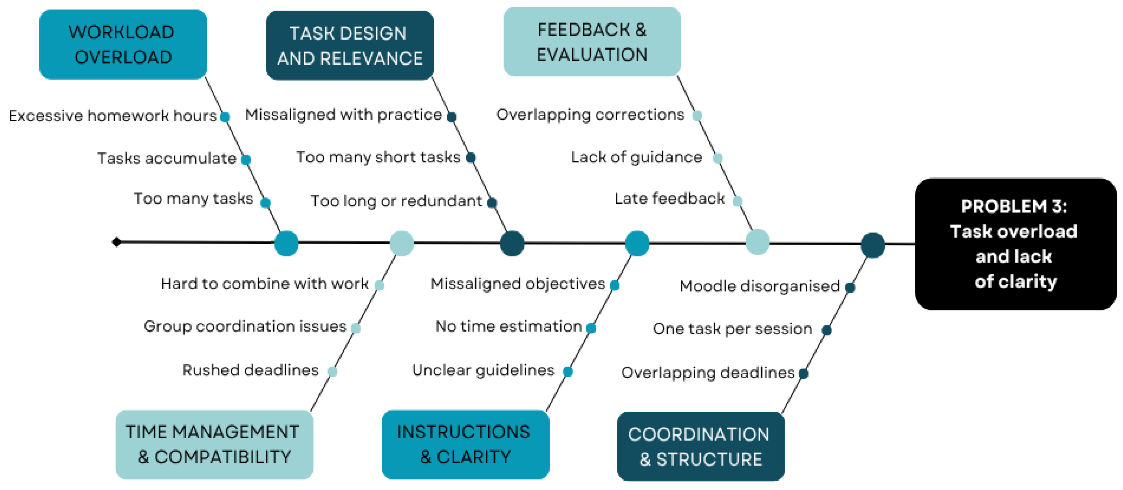 | Moodle disorganized | Standardized task posting and deadlines on Moodle | Unify format and deadlines for all tasks in Moodle. Organize Moodle task areas consistently to reduce confusion. | |