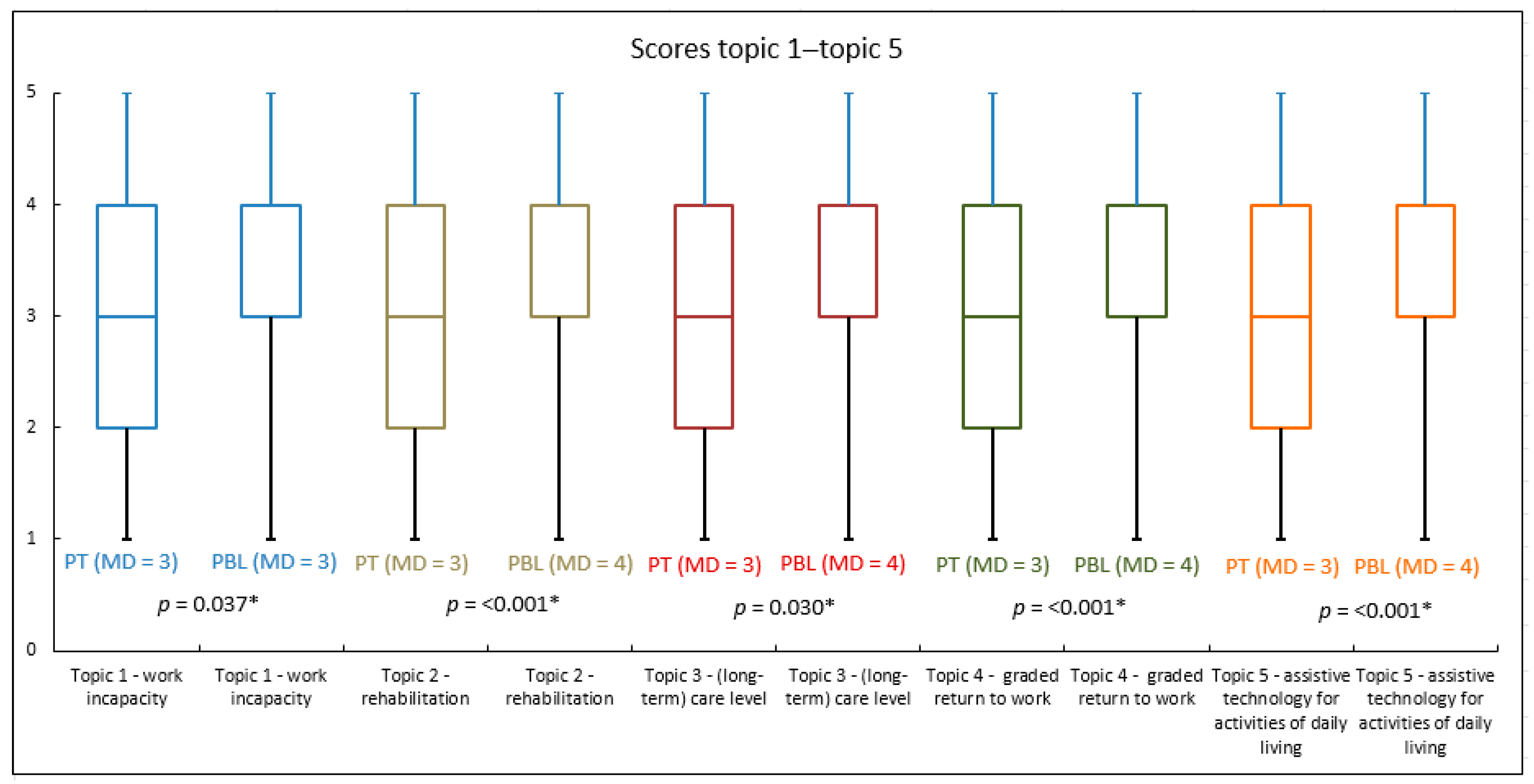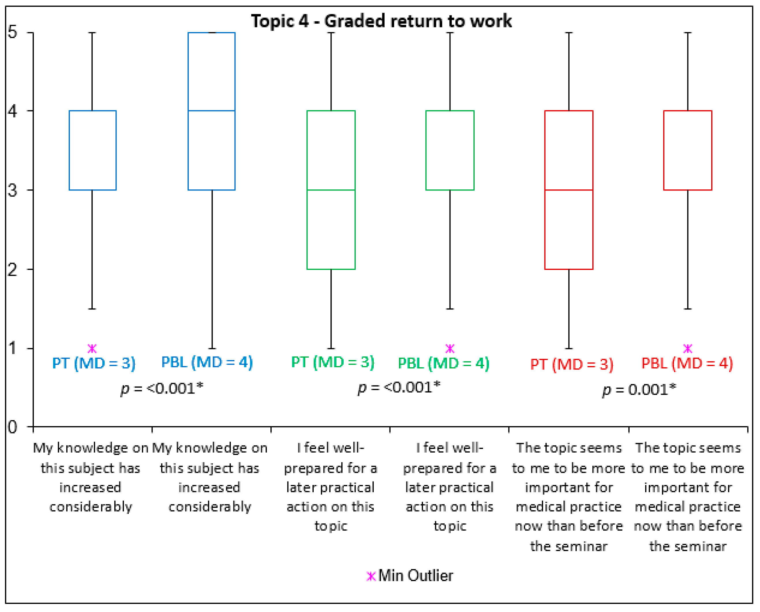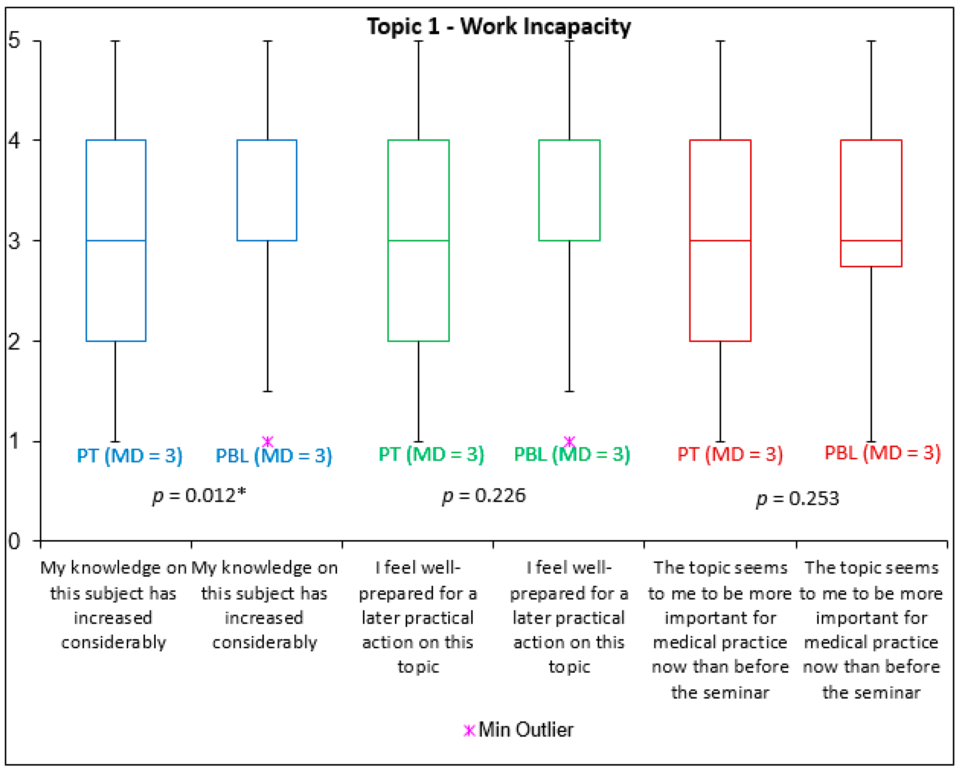 It is also possible that students had previous knowledge about work incapacity through personal experience (e.g., during part-time student jobs). There were also no differences between group PBL and group PT in the perceived relevance of this topic after the seminar. The subjective learning benefit was highest for the topic of graded return to work. Here, the values for previous knowledge and perceived theoretical and practical relevance were also the lowest.