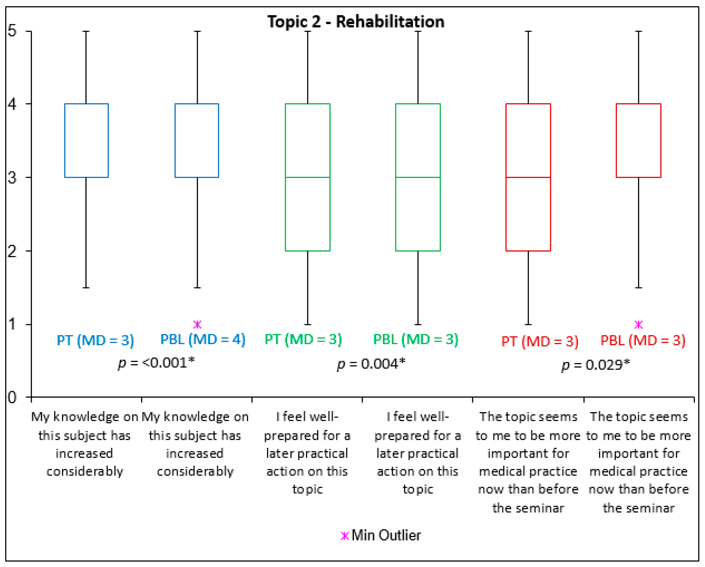 Legend: Mean score values based on three items per topic: knowledge increase, perception of feeling well-prepared for a later practical action, and perceived relevance of the topic) (min = 0, max = 5) (1 = completely untrue; 2 = almost not true; 3 = a little true; 4 = generally true; 5 = completely true); * statistically significant at p < 0.05. Group PBL = students who worked on the specific topic personally and actively in a problem-based approach. Group PT = students were presented the results by their fellow students (peer teaching). 1 Mann–Whitney U test.