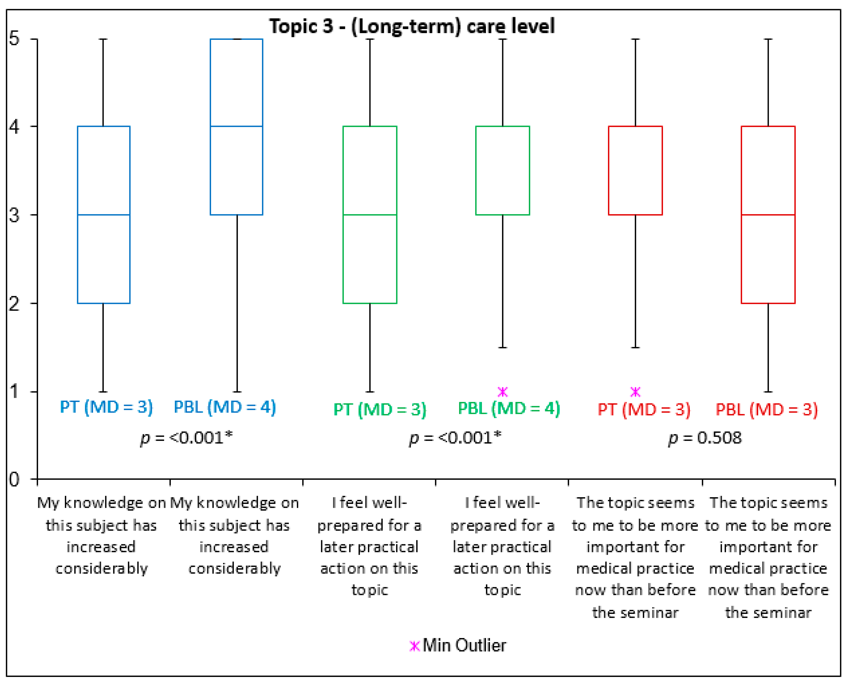 At the item level (see Appendix A Figure A1, Figure A2, Figure A3, Figure A4 and Figure A5), the median for all topics in all groups was in the middle or upper-middle for all three items assessing learning format effects. Especially the format with the problem-based approach showed good effects in the results of group difference analysis: