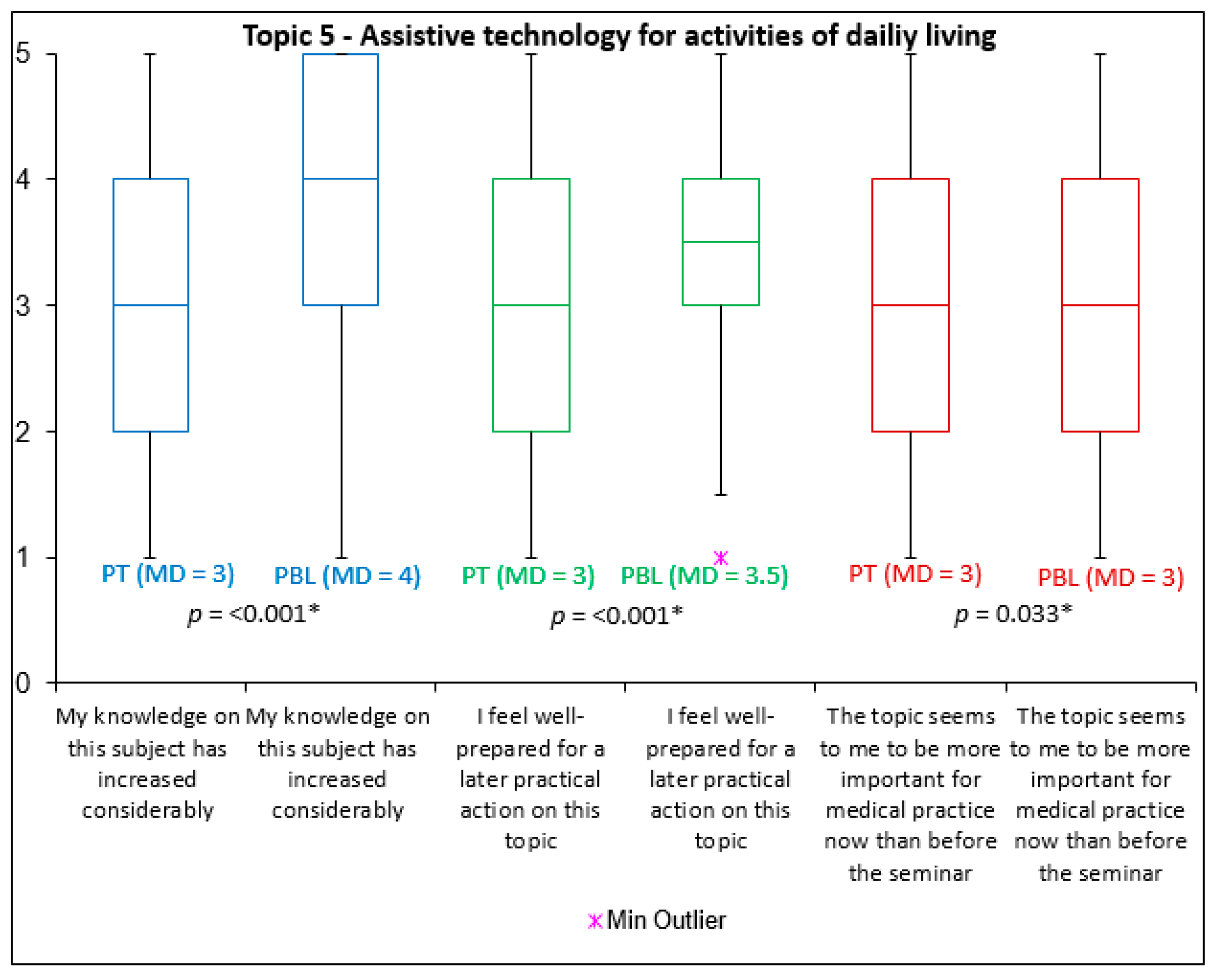 • In addition, the feeling of being well-prepared for a later practical action was significantly higher in group PBL than group PT for topics 2, 3, 4, and 5, with moderate (topic 2 = 0.33; topic 4 = 0.42; topic 5 = 0.42) or high (topics 3 = 0.54) effects.
