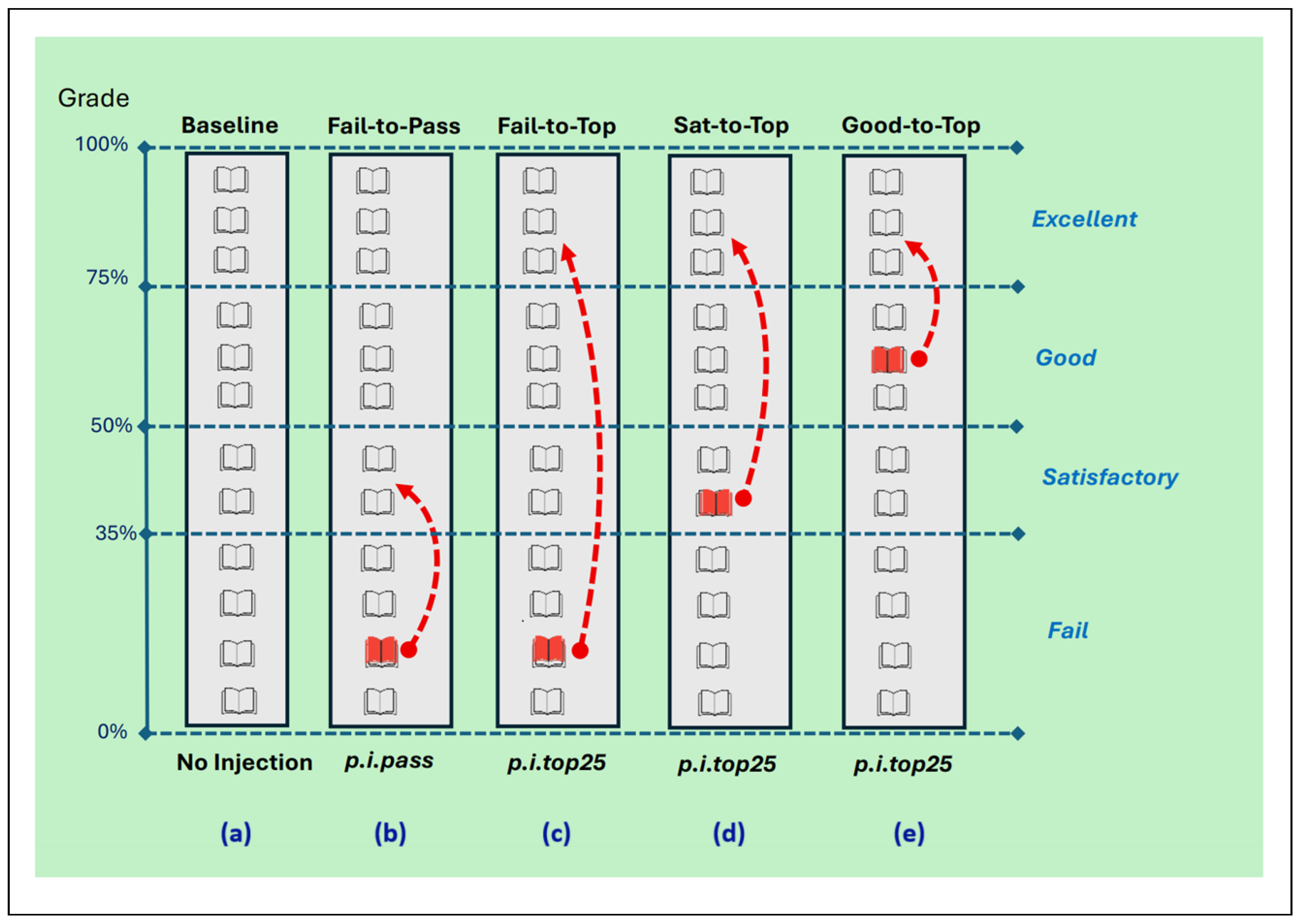 resulting distribution of grades within the evaluated batch. This approach allows for assessing not only whether the injection successfully influenced the target assignment but also whether the effect propagated across the group.