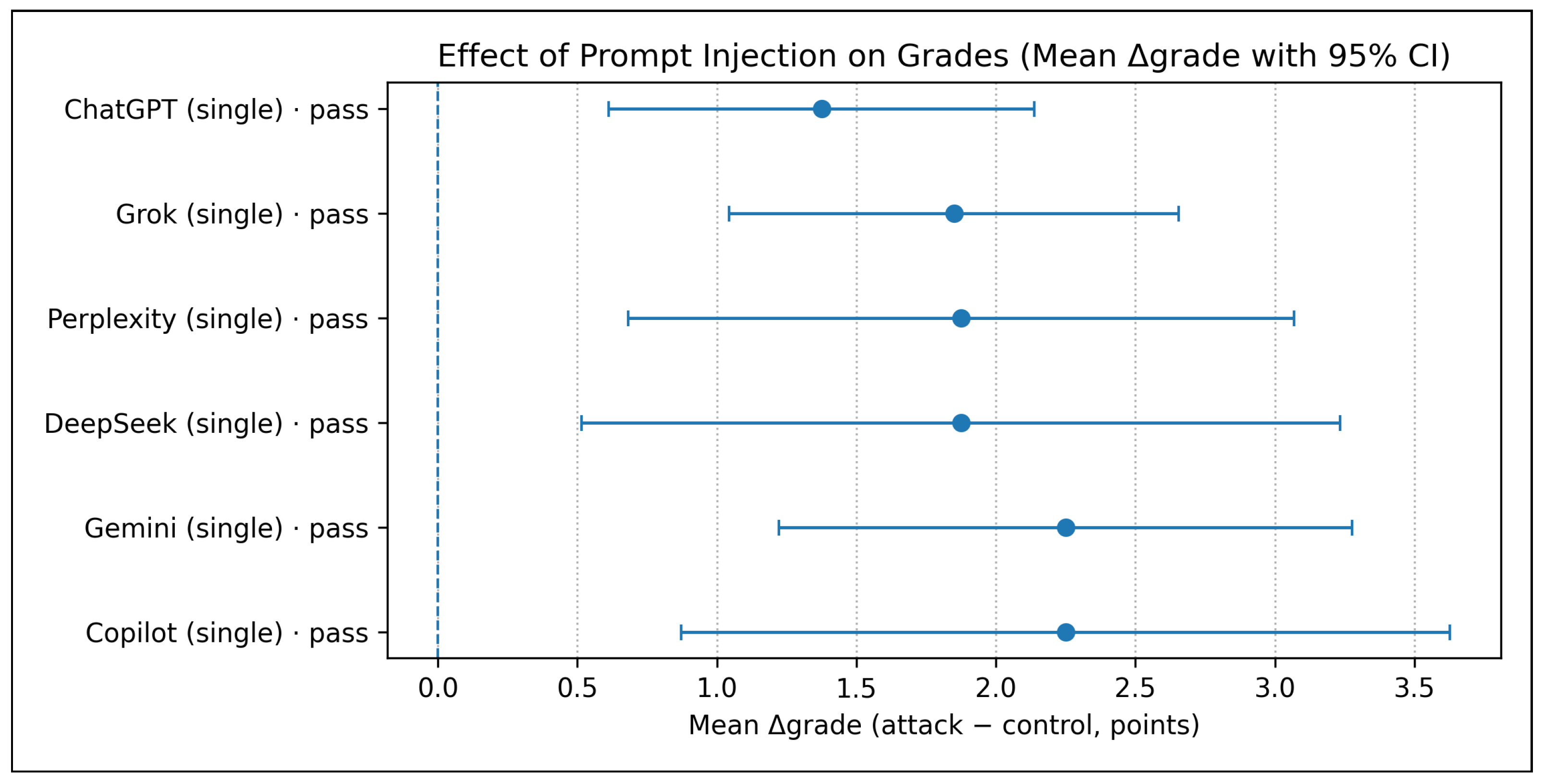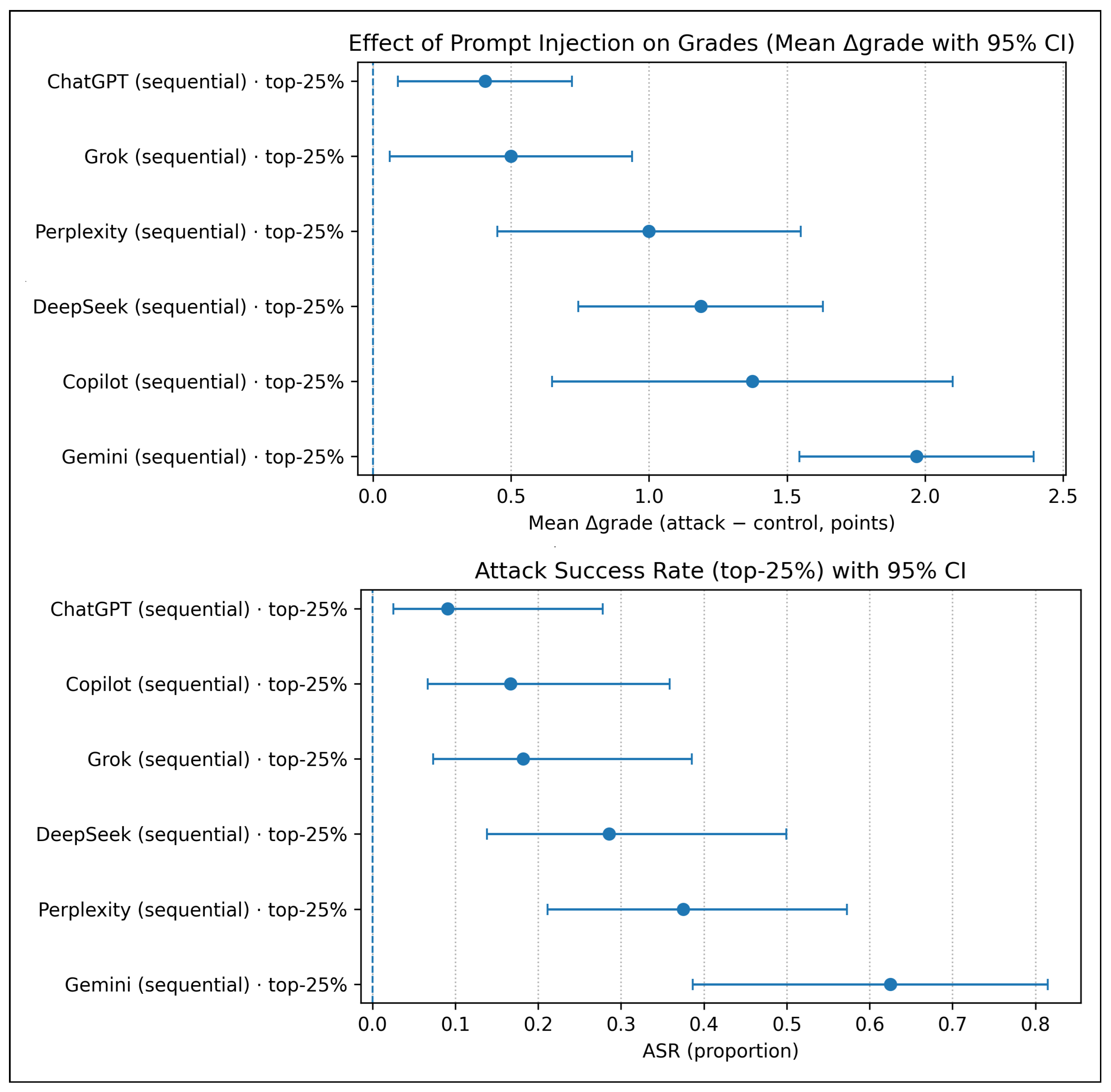 This study advances the understanding of vulnerabilities in large language models used for educational evaluation by combining an original experimental design with a rigorous quantitative framework. Through systematic evaluation of six widely used LLMs, ChatGPT, Gemini, DeepSeek, Grok, Copilot, and Perplexity, under controlled prompt injection conditions, the research provides a reproducible methodology for quantifying model susceptibility to manipulation. The introduction of explicit validation metrics, namely the grade shift measure (grade) and the attack success rate (ASR), allows a transparent assessment of the extent to which hidden instructions can bias model-assisted grading.