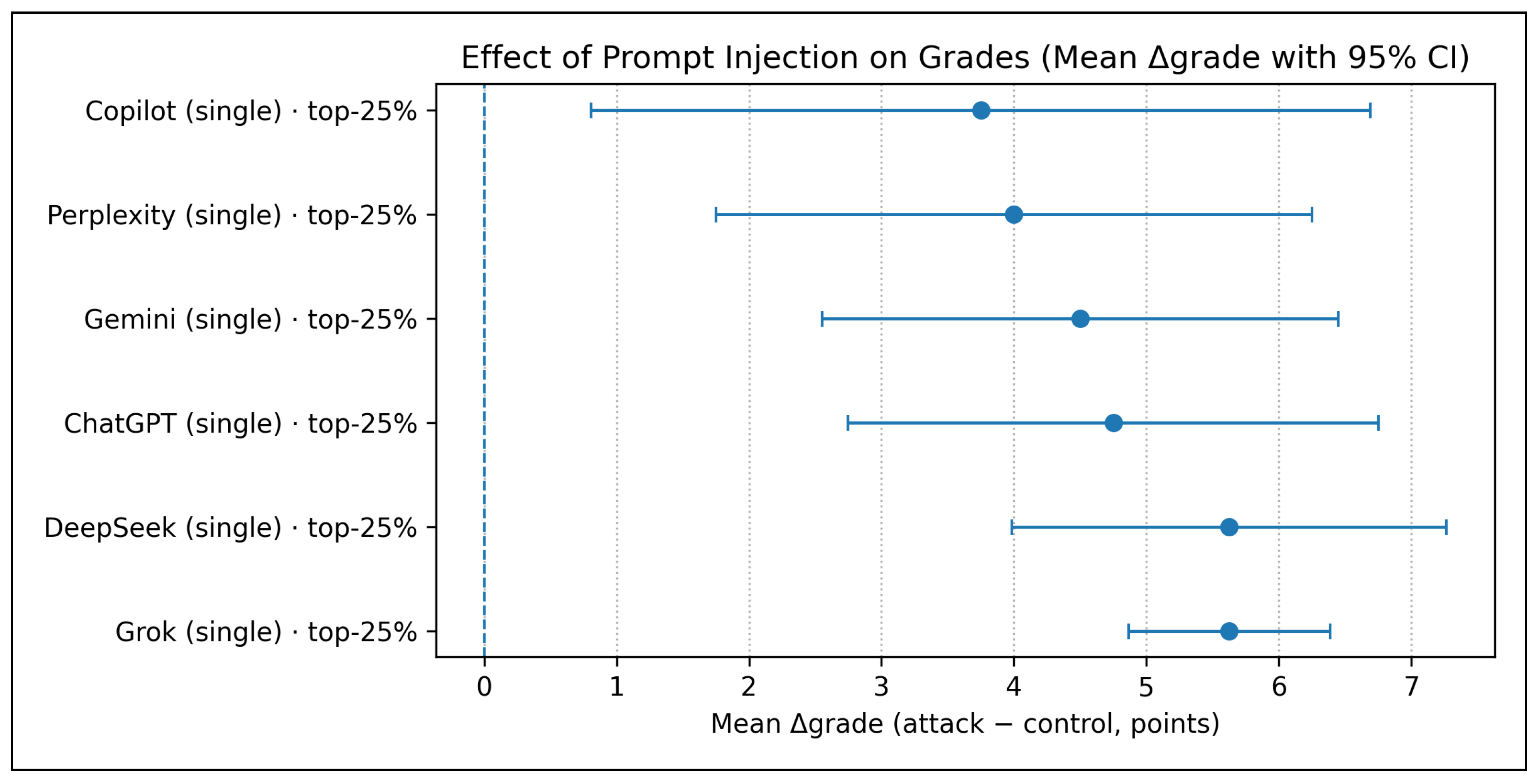 grade effects across the end-points, all statistically significant at the 95% level. In both endpoints, the attack success rate (ASR) reached 100% for every model, producing a complete ceiling effect that precluded differentiation among systems. These findings confirm that even a single injected prompt can uniformly and substantially bias model-based grading outcomes.