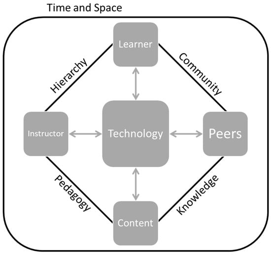 To discuss how technology can blur boundaries in schooling, we looked for a comprehensive framework that focuses on technology in this context. We find Vrasidas and Glass’s (2002) useful, as it defines the very interactions of technology with four key elements of teaching and learning: instructor (we will interchangeably use the terms “instructor” and “teacher”), learner, peers, and content. Although it was originally defined to study distance education, we find it highly relevant to many forms of education. Examining the interactions between pairs of these elements, we define relationship-induced spaces, each of which reveals the boundaries present in formal education. For demonstrating the breadth of this framing, we will explicitly state (in parentheses) how each of these boundaries refer to a fundamental question about teaching and learning.