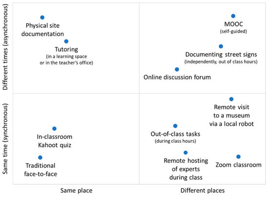 In the top-right cell (different places, different times) are asynchronous online learning configurations, for example, MOOCs (Massive Open Online Courses), which are conducted in such a way that learners from around the world, or even from within a single school, self-guide their own learning process in the course (Kim, 2022; Soffer & Cohen, 2015). This cell also includes learning through online discussion groups, or via tasks in which learners are mobile in physical spaces, e.g., for documenting street signs. In the top-left cell (same time, different places) are, e.g., tasks in which students are asked to visit and document a specific site in their free time, or learning under personal guidance, such as in the lecturer’s or teacher’s office or a dedicated learning space.