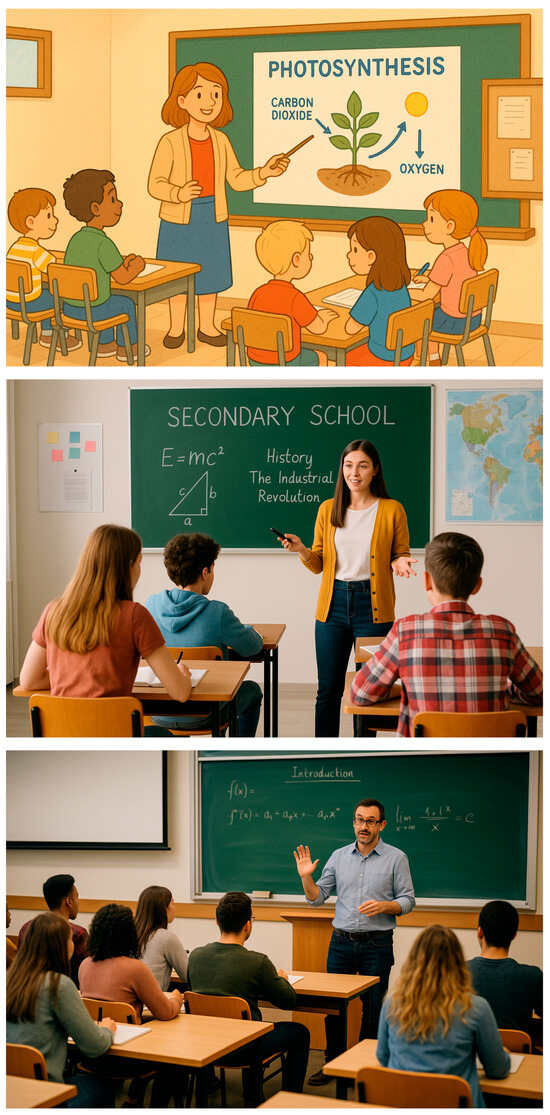 An interesting way to observe the prevailing perception of teaching is to ask generative AI engines to describe such a setting. Since they are trained on vast existing knowledge bases, these engines are inherently biased by existing social stereotypes (Gross, 2023; Srinivasan & Uchino, 2021), making their use for this purpose especially intriguing. Indeed, when generative AI was prompted with: “Draw an image of a lesson in [elementary school/high school/university]”, the resulting images depicted a very traditional setting: a teacher, standing by a blackboard, facing a group of students who are sitting in front tables—each with their own notebook—lecturing to them. (Apropos social stereotypes of generative AI, also note that K-12 teachers are females while the university teacher is a male) see Figure 3.