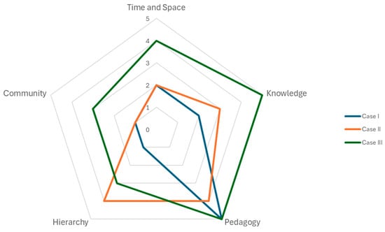 In this section, we will use our framework to analyze technology implementation scenarios that were previously published. Though our selection of authentic cases is anecdotal, it will help us to demonstrate how our framework is useful to understand such integrations in a nuanced manner. For doing so, we arbitrarily chose a few recent empirical papers published in Education Sciences; we chose papers that explicitly describe technology integration in authentic educational settings. These cases were selected to illustrate how the framework can be applied across varied educational settings. While not comprehensive, these three cases taken together highlight the framework’s flexibility and relevance. In this section, we briefly describe the relevant aspects of technology integration in each of these cases, and then analyze the extent to which each scenario promotes boundary blurring, on a scale of 1 (not at all) to 5 (very much so); this ranking should be taken with a grain of salt, as its main purpose is to demonstrate the nuanced understanding of technology integration that our framework allows. Analysis is summarized in Table 1, with a visual radar chart in Figure 4.