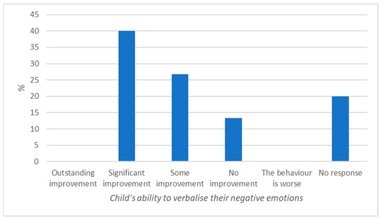Participants were asked to focus on one child whom they supported and rate that child’s social and emotional wellbeing indicators, see Table 3. The focus on only one child is a limitation of the study and tempers the results. The results are mixed, as could be expected given that there was only one child selected by each participant without clear selection criteria. They were then asked to report the perceived level of behaviour change the child experienced after engaging with the programme (Figure 1 and Figure 2). The participants suggested that there were apparent improvements in observable behaviours, such as the number of times the child loses control of their emotions (5 children—see Figure 1) and the child’s ability to explain why they are upset (6 children—see Figure 2).
