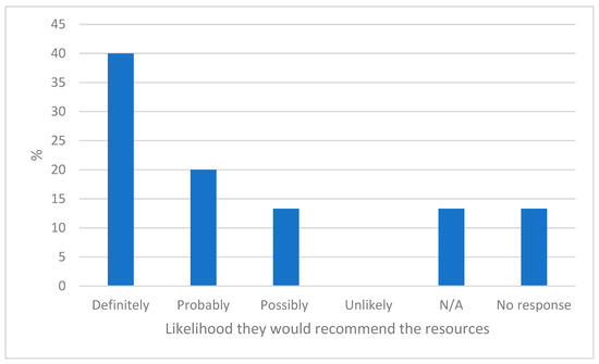 Likelihood of participants recommending the resources (N = 15; N/A = participants who said they had not yet fully engaged with the resources).