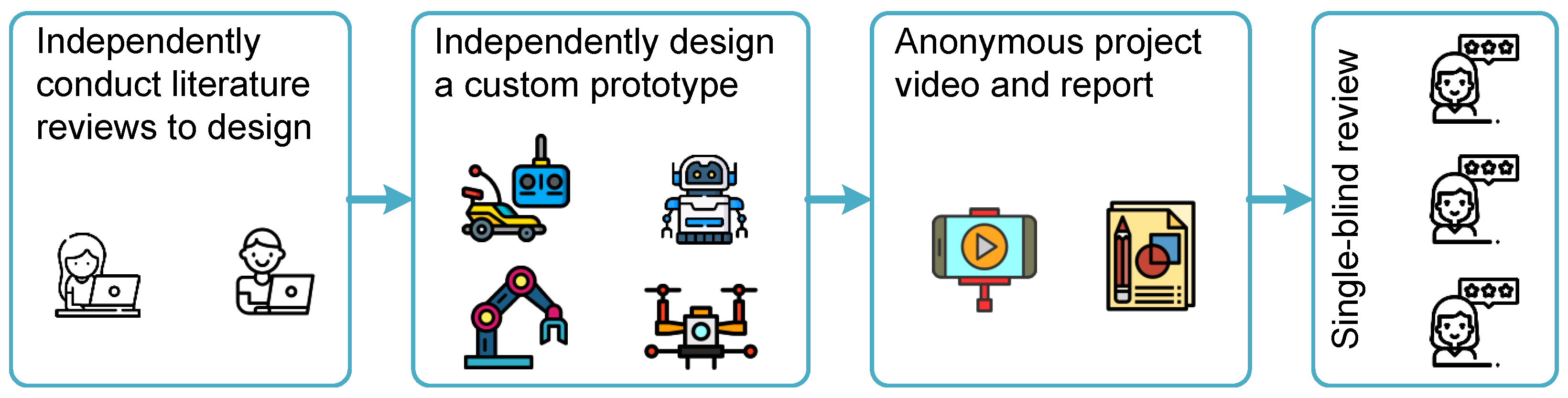 Students are randomly assigned to one of these five modes, with the randomization constrained by the overall distribution of students’ prerequisite course grades to ensure comparability across modes. The detailed allocation method will be described in Section 3.5. Under different assistance modes, students conduct literature reviews, determine the project content, implement the design, and prepare both a project video and a written report. These deliverables are then anonymously submitted, and three instructors perform single-blind grading. As described in the Section 3.1, the FPGA-Based Embedded Course has historically been a student-driven experimental course. Therefore, redesigning the course to incorporate different assistant modes and assigning them randomly does not introduce unfairness.