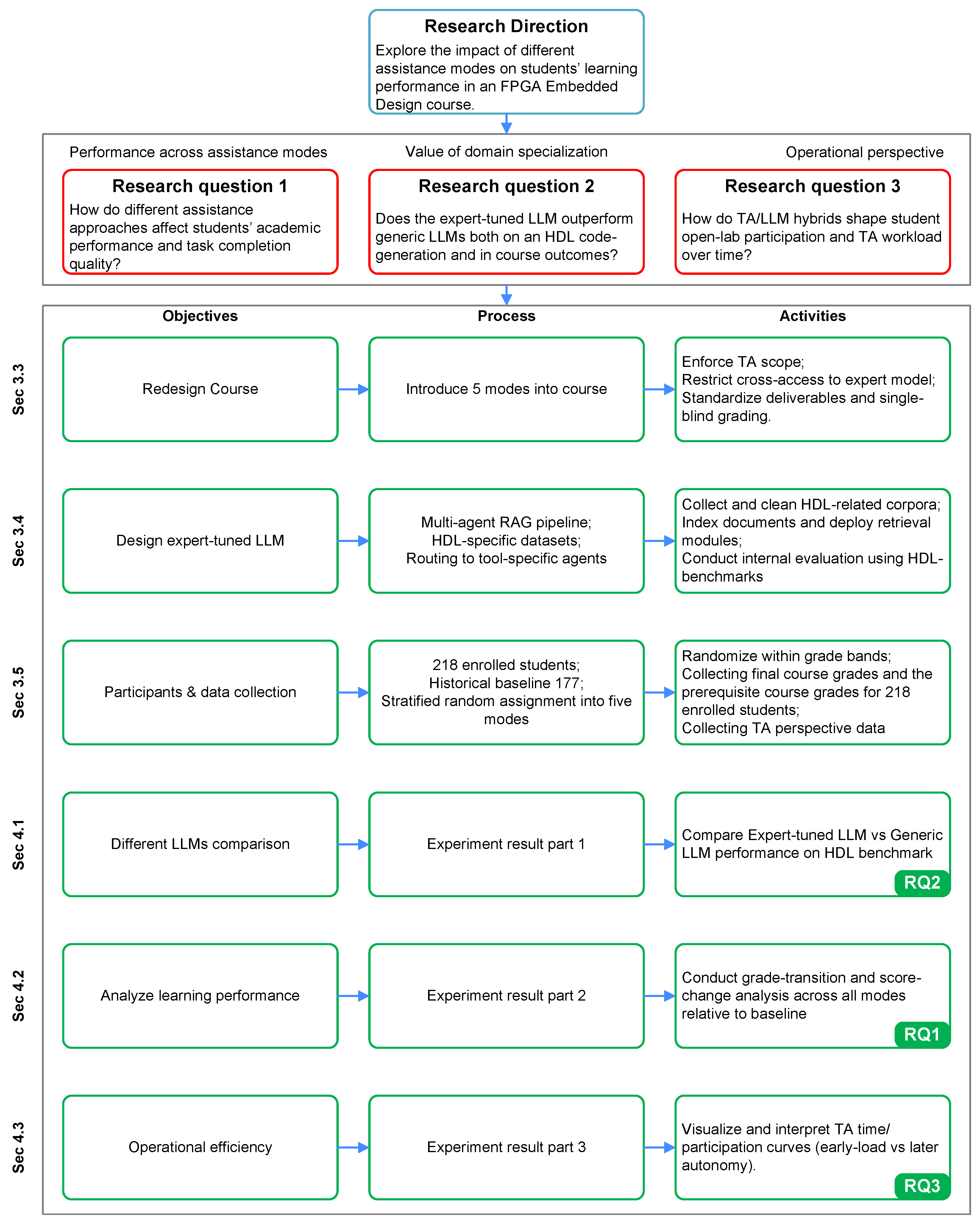 Following the overview design described above, this study is structured around three overarching research questions that align with the redesigned instructional process, as shown in Figure 2. RQ1 (performance across assistance modes): How do different assistance configurations—ranging from human-only to AI-only and hybrid modes—affect students’ academic performance and the quality of their FPGA design outcomes? RQ2 (value of domain specialization): Does an expert-tuned LLM, trained on HDL-specific corpora, outperform generic LLMs in both technical accuracy and educational impact? RQ3 (operational efficiency): How do different assistance configurations influence TA workload patterns and students’ autonomous engagement over time?