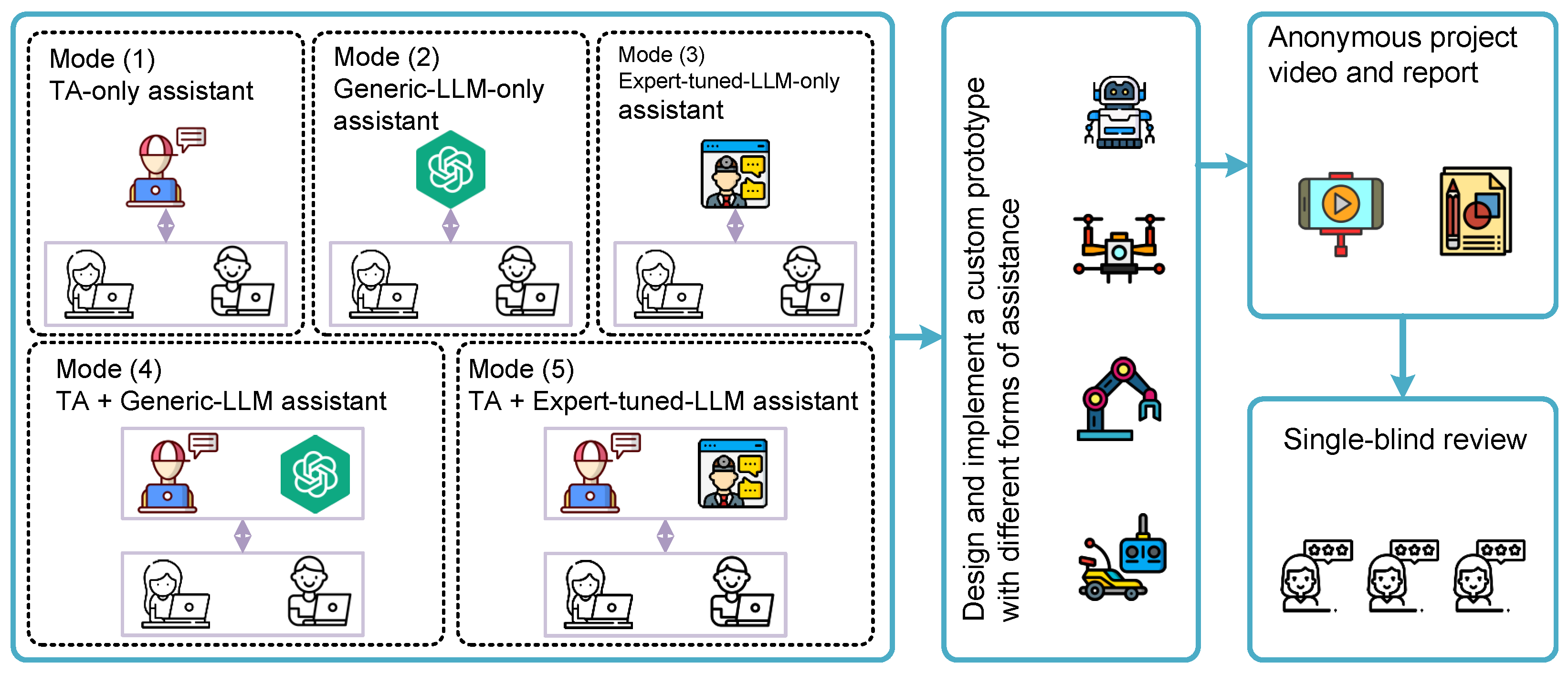 In Mode (1), the TA is limited to addressing practical engineering issues and writing-related questions encountered during the design process. The TA does not respond to any inquiries regarding LLM usage, even if students in Mode (1) privately use LLMs. In Modes (2) and (3), no human TA is involved; students complete their designs solely with the assistance of LLMs, differing only in whether they use a generic model or an expert-tuned model. Under the current configuration, Mode (2) students cannot access the expert model, although it is not possible to fully prevent Mode (3) students from privately using Generic-LLMs. In Modes (4) and (5), TAs do not directly assist with practical engineering or writing issues. Their contribution is confined to helping students enhance or adjust prompts used in LLM interactions. The design of modes (4) and (5) is grounded in prior studies Jishan et al. (2024); Kim et al. (2023); Y. Ma et al. (2024) demonstrating that prompt quality substantially affects LLM performance. This effect is amplified in specialized fields, where well-structured prompts significantly improve LLM outputs. For STEM undergraduates, this underscores the challenge of precisely formulating domain-specific prompts.
