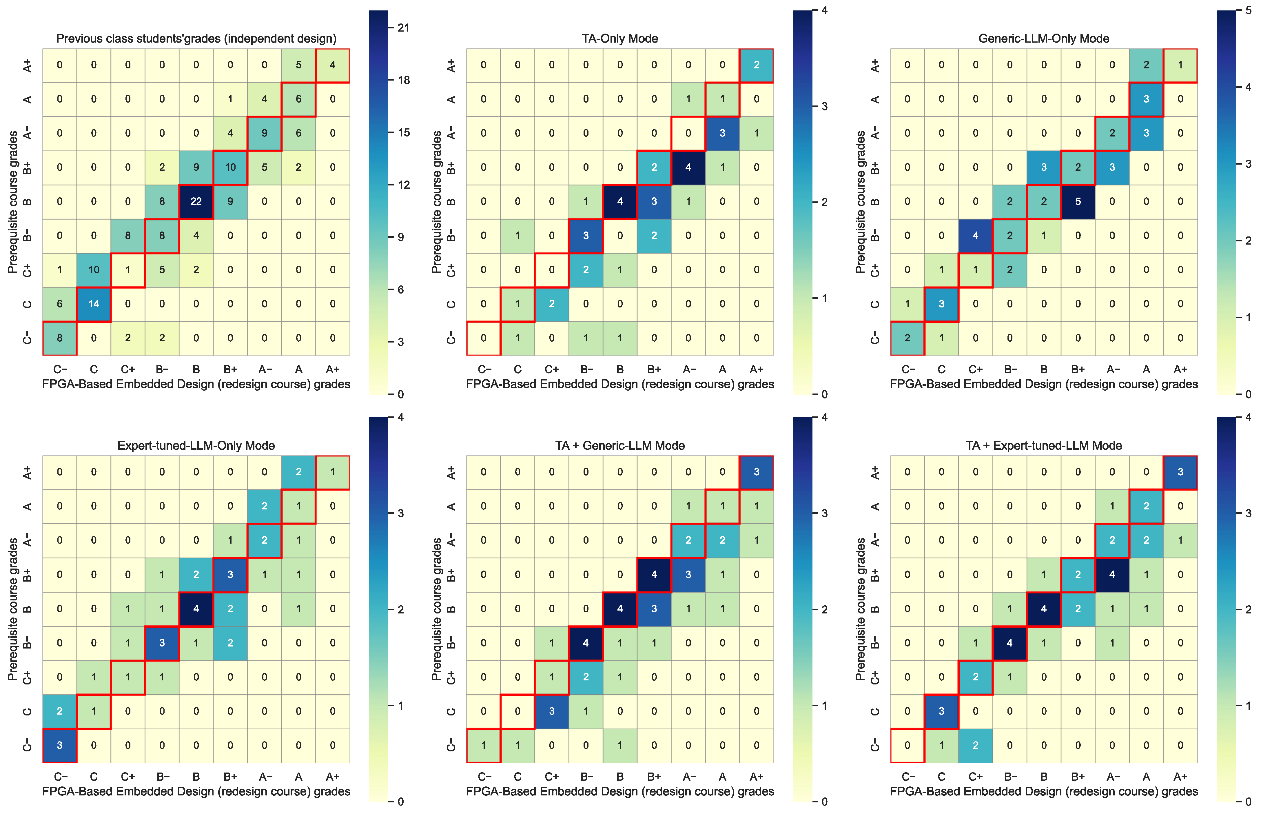 Figure 7. Heatmap comparison of the relationship between prerequisite course grades and FPGA-based embedded design grades across different TA models and previous class student.