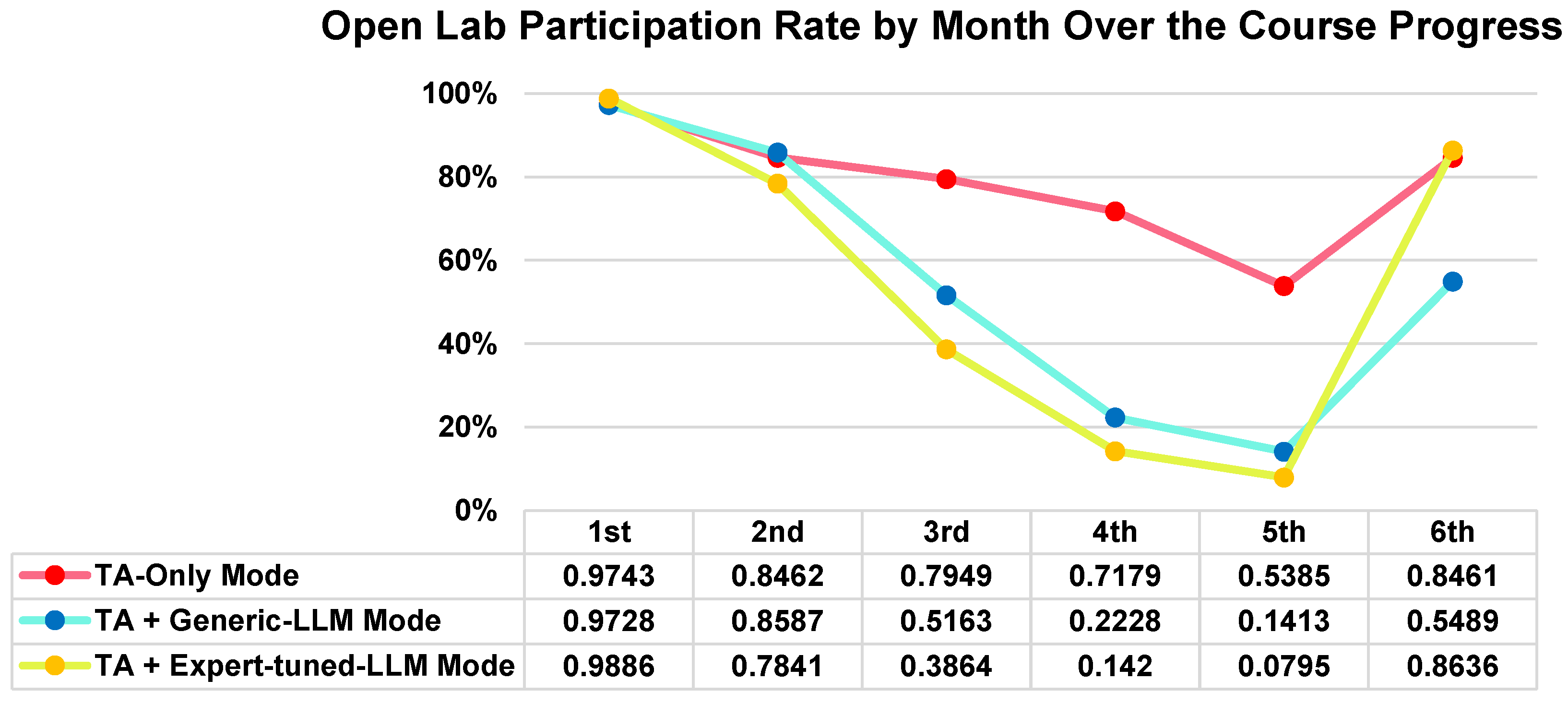 The above results highlight the significance of human TA involvement in improving students’ performance in the course. To further compare the differences across various TA-supported modes, teaching assistants recorded the duration of each monthly support session in the open lab, along with the student attendance rate.