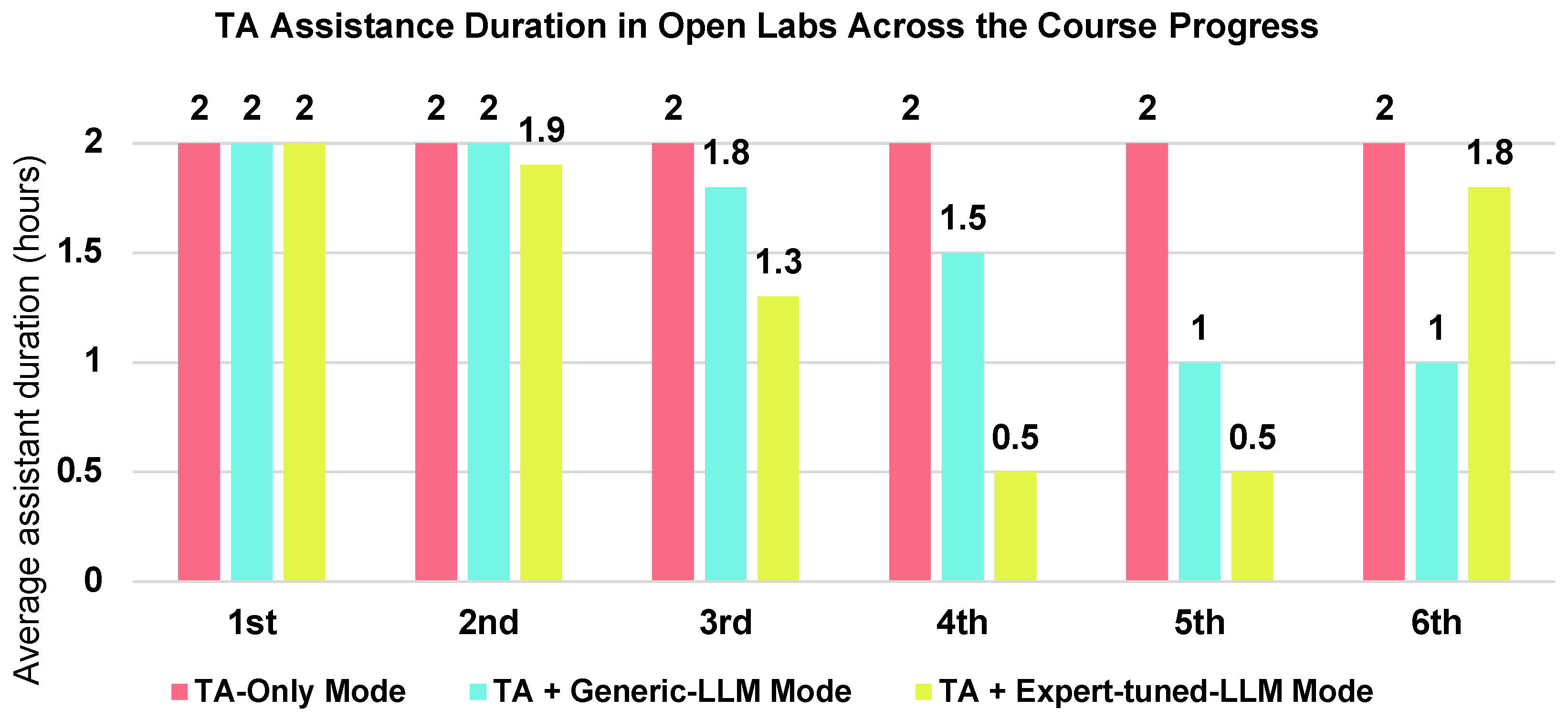 From the TA perspective, we asked each TA to record two key metrics throughout the course: (1) the number of students who participated in the weekly in-person support sessions in the open lab, and (2) the duration of assistance provided by each TA during the course.
