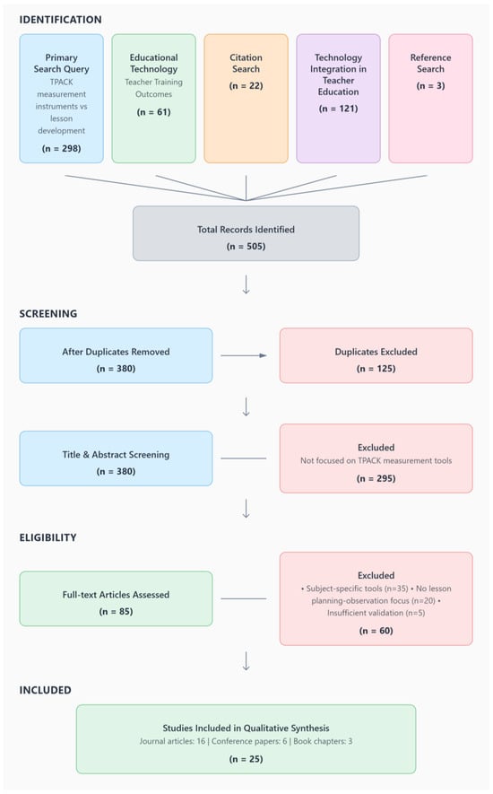 The second phase of the process empirically justified the theoretical choices and established an empirical basis for the instrument. Two systematic reviews were conducted. First, existing TPACK measurement instruments were examined. Studies were included if they used, described, or developed instruments for measuring TPACK among pre-service or in-service teacher educators. The search strategy combined AI-powered platforms, such as SciSpace, with established academic databases (e.g., Web of Science, Scopus, ERIC, Google Scholar) using the primary search query “TPACK” AND (“instrument” OR “rubric” OR “assessment”) AND (“validation” OR “development”) AND “teacher”. Complementary searches of gray literature and targeted themes (e.g., educational technology and teacher training) expanded the coverage. This process led to the identification of 505 records. Following systematic screening and eligibility assessments, 25 studies were included in the qualitative synthesis—comprising 16 journal articles, 6 conference papers, and 3 book chapters (Figure 2).