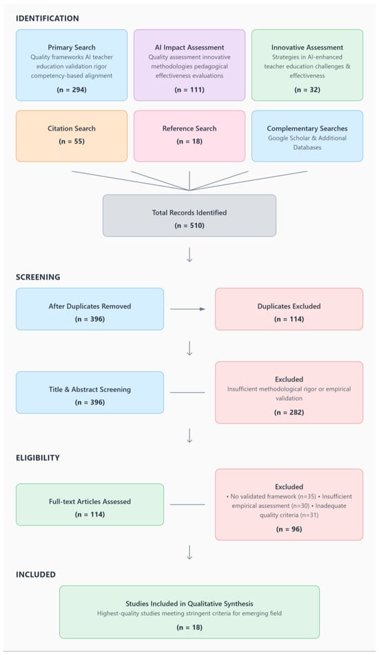 Following the removal of duplicate items, 396 records were screened by title and abstract. Of these, 282 were excluded for insufficient methodological or empirical quality. The remaining 114 full-text articles were then reviewed in detail by the authors, resulting in the exclusion of another 96 studies, due to the lack of a validated framework (n = 35), insufficient empirical assessment (n = 30), and inadequate quality criteria (n = 31). The final synthesis comprised 18 studies that met all inclusion criteria, representing rigorous and empirically grounded research on frameworks for AI integration in teacher education (Figure 3).