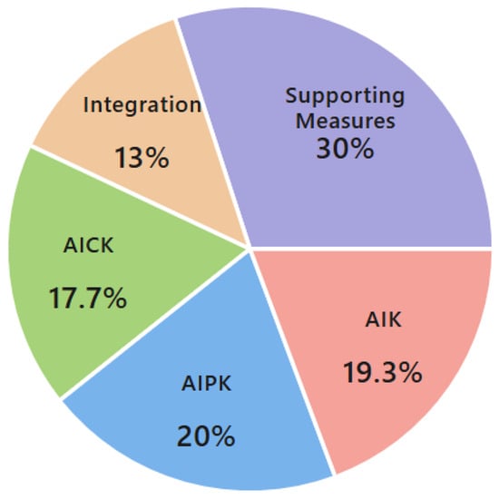 The pie chart in Figure 5 illustrates the normalized weight distribution of the final AI-TPACK assessment instrument, based on the fundamental 70%/30% theoretical split (Core Components/Supporting Measures). The overall scoring model allocates 70% of the total score to the four core AI-TPACK knowledge components (AIK, AIPK, AICK, Integration), and 30% to the three crucial supporting measures (Reflection, Engagement, and Innovation). This distribution highlights two key structural findings: (1) The Supporting Measures collectively constitute the largest single segment, emphasizing the tool’s focus on practical, non-technical aspects like reflection and innovation. (2) Among the Core Components, AI-Pedagogical Knowledge (AIPK) carries the greatest proportional weight, underscoring the priority of pedagogical application over pure technical knowledge in the instrument’s design. The full breakdown of the 14 criteria, including the final normalized weight percentage for each item, is detailed in the assessment rubric located in Appendix B.