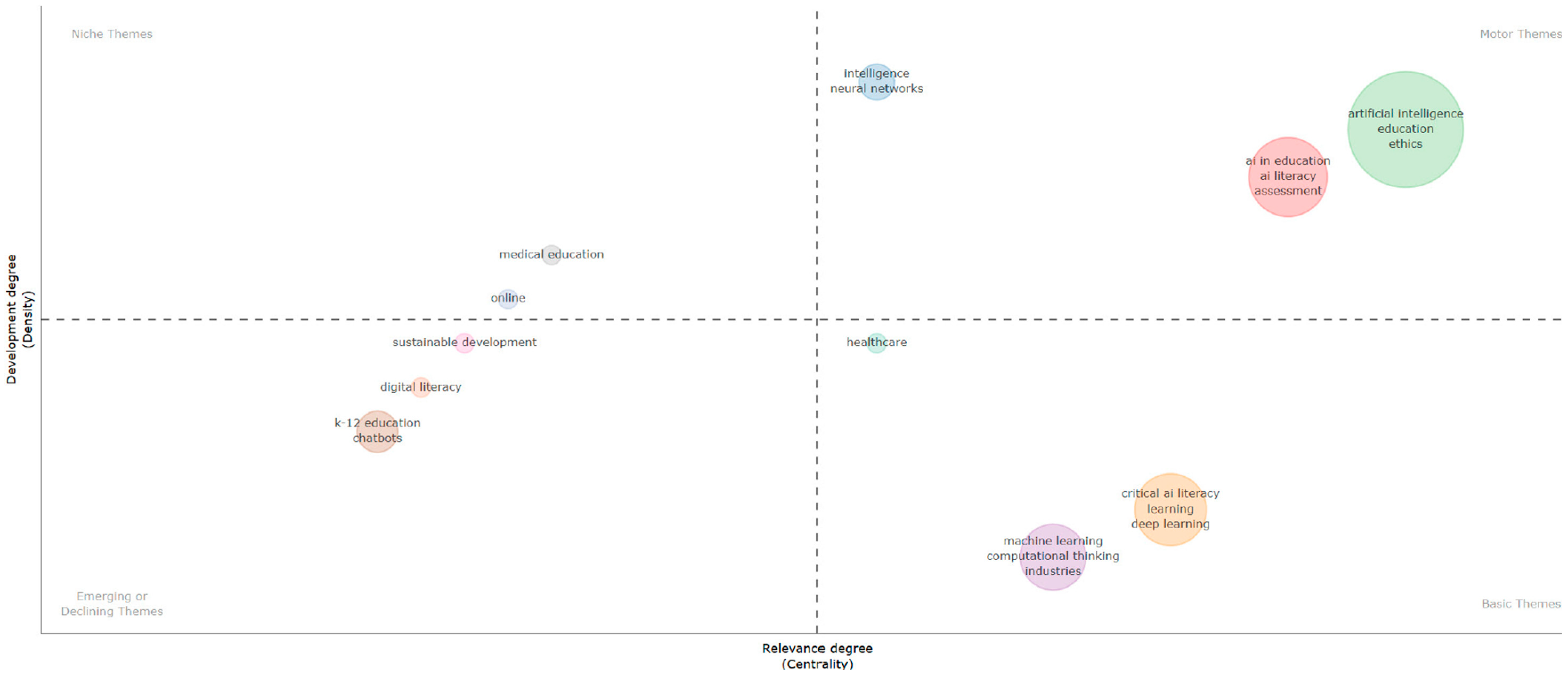 - Foundational phase, 2017–2022: The initial period shows a broad interest in fundamental AI concepts (“artificial intelligence,” “machine learning”), their application in education (“AI in education”), and critical skills (“critical AI literacy,” “digital literacy,” and “computational thinking”). Ethical considerations (“ethics”) are already a motor theme, indicating early awareness. Sector-specific applications such as “healthcare,” “k-12 education,” and “medical education” appear as distinct, albeit less interconnected, areas.