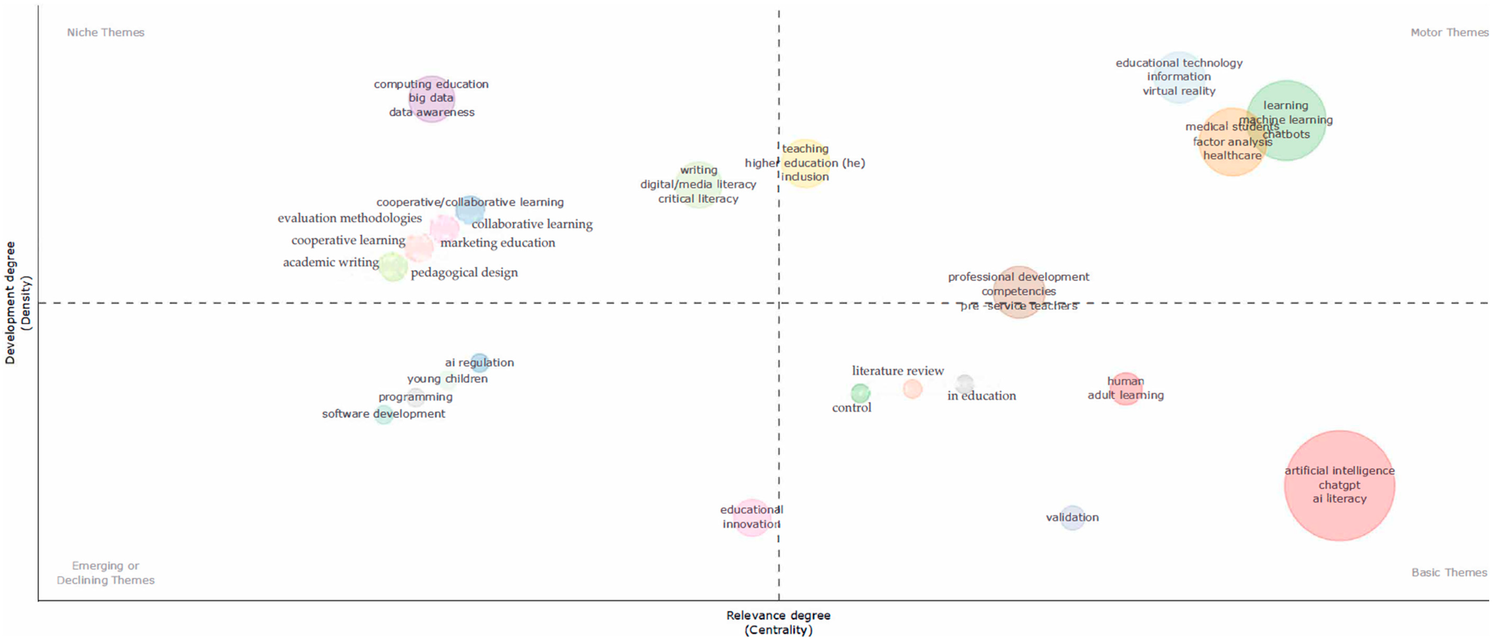 - A shift in the focus to human elements is detected in recent periods. The field is steadily moving beyond purely technological discussions of AI toward a more nuanced understanding of its integration into human learning environments. Early dominance of core AI concepts (e.g., “machine learning” and “deep learning”) as distinct basic themes gives way to their integration, while “basic” and “emerging” quadrants increasingly feature terms such as “competencies,” “teacher training,” “student well-being,” “engagement,” “motivation,” and “teacher perception.” Future research should prioritize the human experience of AI, focusing on how AI impacts learners, educators, and the educational process itself. This includes developing evidence-based pedagogical designs and understanding the psychological and social implications of AI.