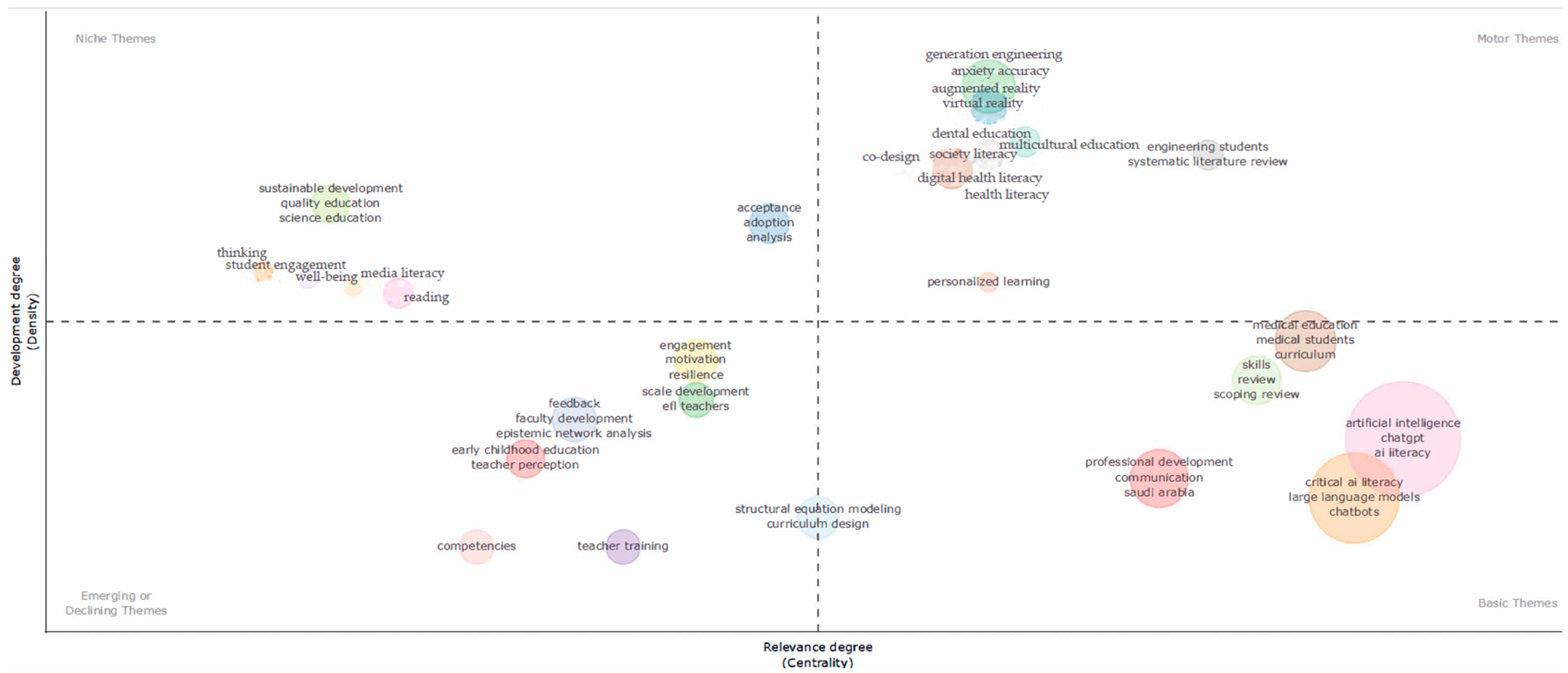 - Basic Themes (Bottom Right): High centrality, Low density. Foundational concepts, cross-cutting but less internally developed (often because they are broadly accepted prerequisites).