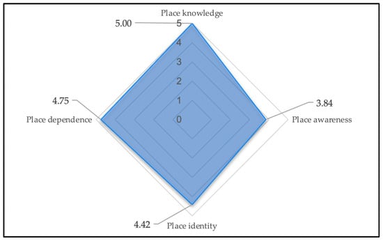 Analysis of post-intervention scores by component (Figure 1) revealed that students achieved the highest possible average in place knowledge, indicating comprehensive familiarity with the school environment. Place dependence and place identity also scored highly, reflecting strong functional and emotional connections. Place awareness, while still in the upper range, was comparatively lower, suggesting potential for further growth in recognizing environmental and social values embedded in the school setting.