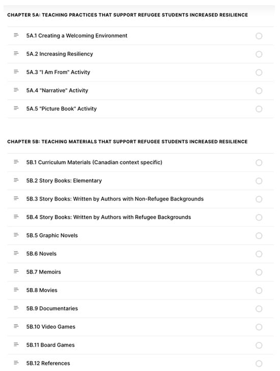 Lastly, we integrated Social Emotional Learning (SEL) theory as a way to define trauma as a healable wound (), and to describe traumatic triggers and how to respond to them, using research-based activities to support the healing process. Research suggests that SEL as a school-based intervention is an effective way to support newcomers to overcome disruption to family routines or discrimination and can improve students’ mental health, academic success, and social inclusion (; ). Indeed, () found that SEL has a direct impact on academic success because cognitive, meta-cognitive, and social and emotional processes are interactive, and contribute both to motivation and to learning. To leverage this concept in our manual, we discussed teachers’ common concerns and questions and provided relevant support, resources, and strategies for physical, psychological, social, familial, and communal dimensions of students’ lives (see Figure 1. screen capture of all the manual’s chapter titles, shows the breadth of content available to educators). Our manual emphasizes the importance of acknowledging, listening, and integrating students’ lived experiences into the learning context to improve their overall well-being and academic success (). From modelling kindness, empathy, and new customs or daily school routines, to introducing students to peers and community-based activities, our manual seeks to provide tangible and realistic solutions that do not lead to teachers feeling overwhelmed. While acknowledging that most BC teachers have not been adequately prepared to teach refugee students (), we invited teachers to scaffold using the teaching strategies and resources provided through the EdTech resource so that their classrooms are more equitable and welcoming, and support students to reach their potential (). To aim to address teachers’ needs, we infused a tri-framework made up of culturally informed theory, a strength-based approach, and SEL.