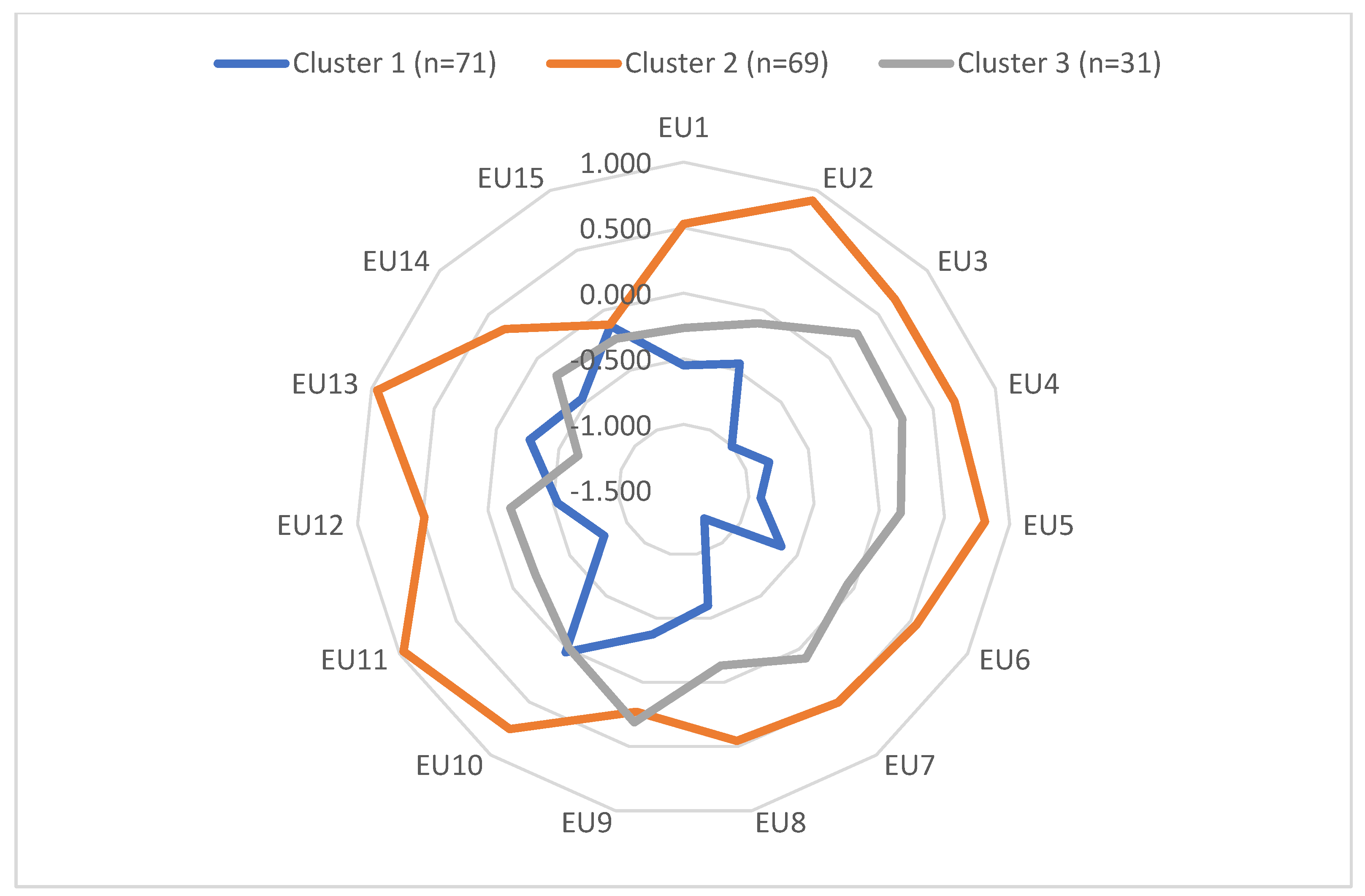 | Cluster 1 (n = 71) | Cluster 2 (n = 69) | Cluster 3 (n = 31) | ||