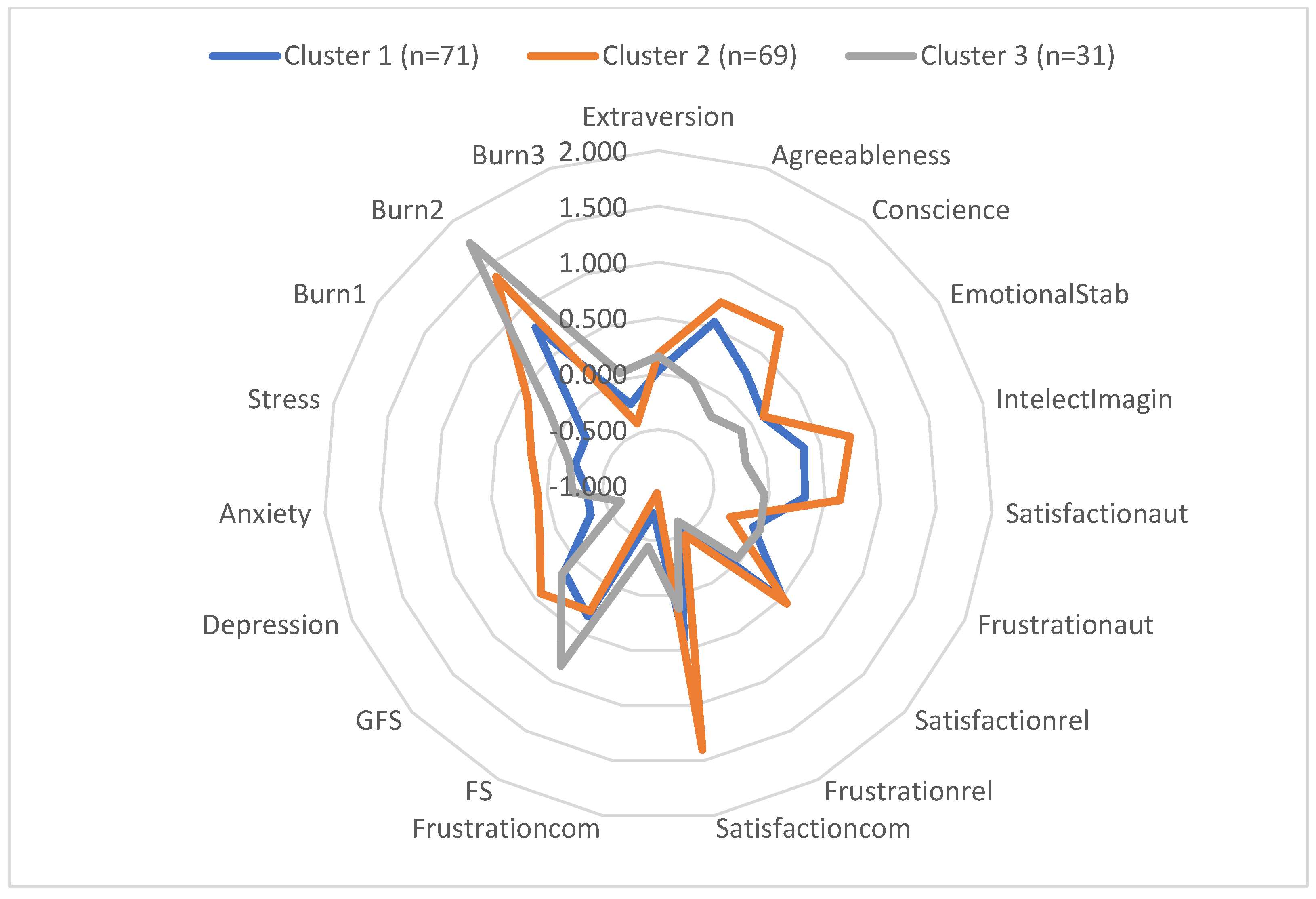 | Scale | Subscale | Cluster 1 (n = 71) | Cluster 2 (n = 69) | Cluster 3 (n = 31) | Cluster 1 vs. 2 | Cluster 1 vs. 3 | Cluster 2 vs. 3 |
