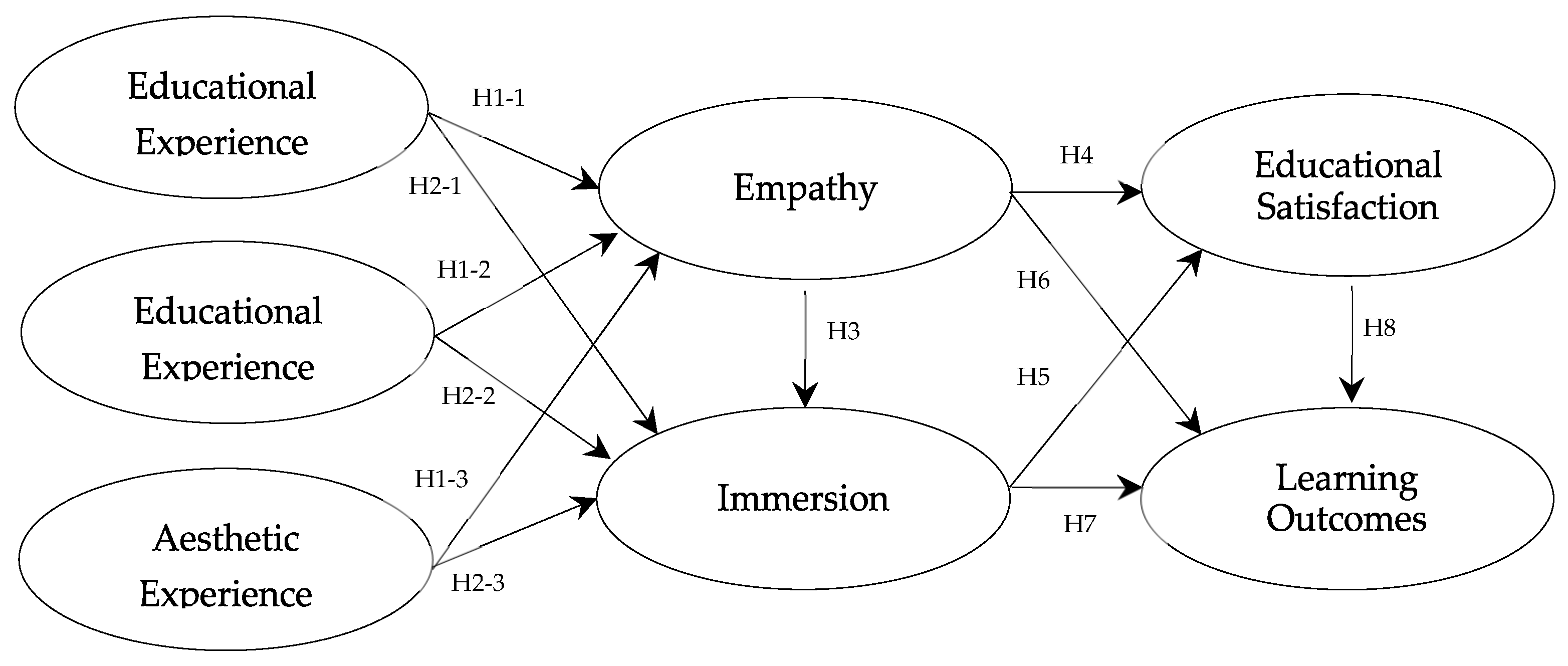 Empirical research has demonstrated that entertainment and aesthetic experiences are positively associated with empathy and affective engagement in creative and immersive learning environments (Huang & Hew, 2022; Y. Kim & Lim, 2023; J. Lee et al., 2022). When learners find activities enjoyable and aesthetically appealing, they are more likely to identify emotionally with their outputs or peers, thereby heightening empathy (Li et al., 2024; Batson, 2011). Conversely, educational experience, which involves cognitive and instructional elements, may either support or hinder empathy depending on its cognitive demand (Y. S. Chang & Wu, 2023; Mayer, 2022). Hence, the following hypotheses are proposed: