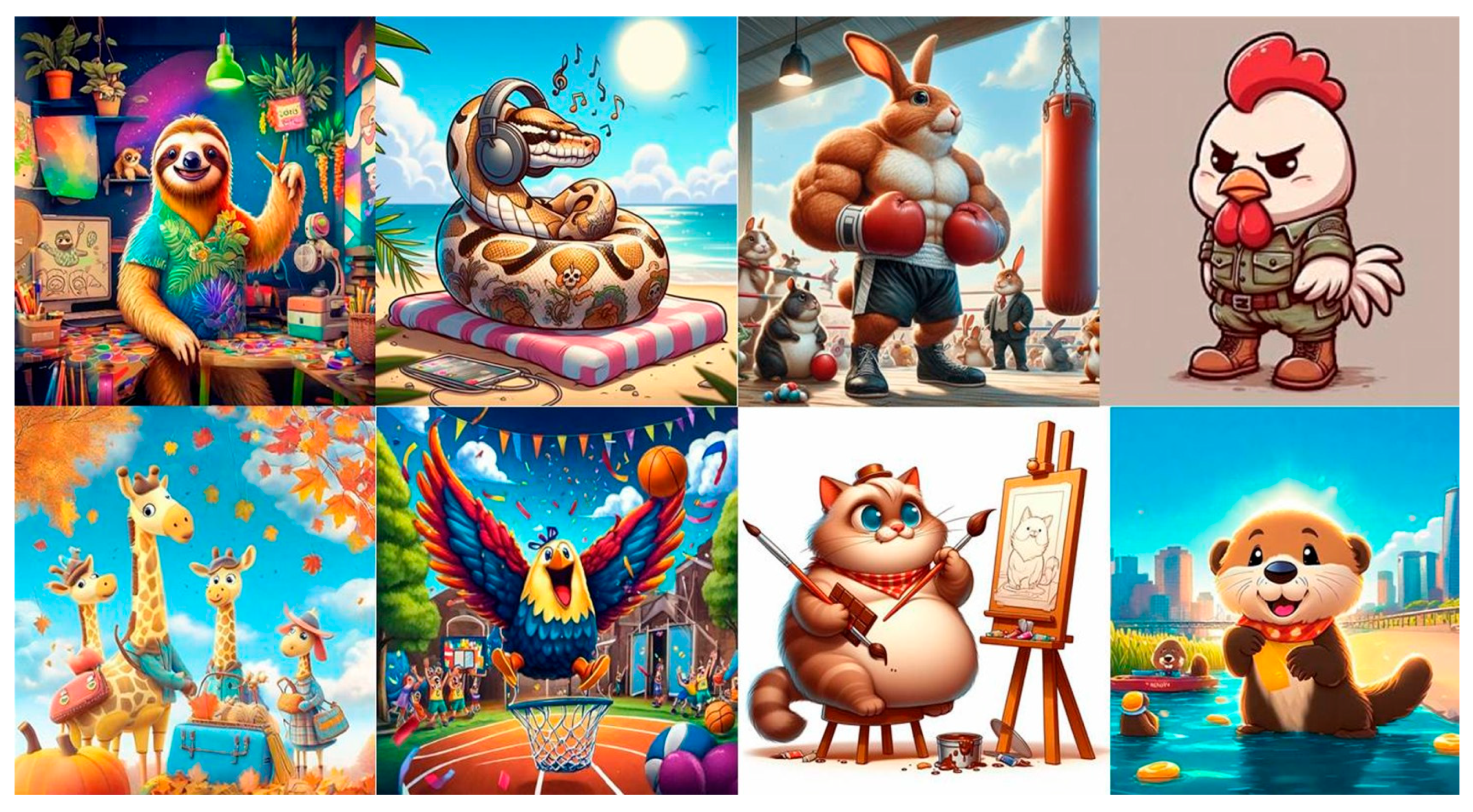 Students learned prompt engineering basics using freely accessible tools such as Bing Image Creator (DALL·E-based) and Stable Diffusion. Each participant selected identity-relevant keywords—e.g., age, look-alike animal, nickname, hobbies, profession, salient traits, and aesthetic preferences—and composed initial prompts. This phase served as an ice-breaking activity that expanded verbal self-introduction into visual self-expression, encouraging interaction and empathy.