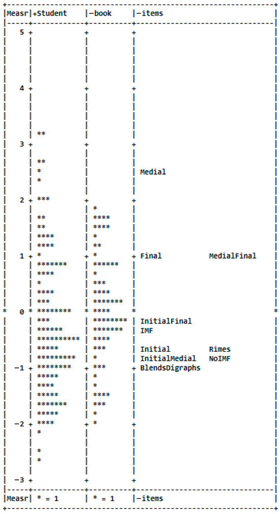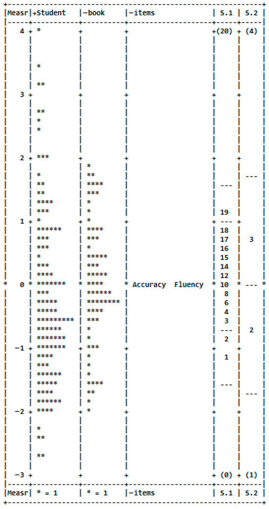 The reading proficiency Rasch scale produced from the analysis of the accuracy and fluency scores of the 129 students and 75 books (Figure 2 in D’Agostino & Briggs, 2025) is reproduced here as Figure 1. The distribution of students and books (each student or book is represented with an asterisk in their respective columns) is displayed vertically in the figure, with the more proficient students and more difficult books at the top of the figure. As expected from the sampling scheme that was designed to maximize student variance, there is considerable spread among the 129 first-grade students on the proficiency scale. Indeed, the dispersion of students is greater than the spread of the book difficulties. The books were selected to cover multiple grade levels, but without a student sample that represented multiple grades, it was not possible to estimate with a sufficient degree of accuracy the grade-level span of the books from the analyses presented in Figure 1.
