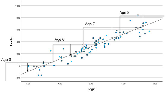 To obtain a better sense of the normative span of books, we obtained the Lexile values for each of the 75 books. The book Lexile and Rasch scale values are plotted in Figure 2. The correlation between the metrics was r = 0.94. The figure also shows the Spring interquartile range (gray lines) and median Lexile scores (arrows) for Ages 5 through 8, which translate to grades K-3 in the US (MetaMetrics, 2024). It is evident from the figure that the books adequately cover the upper half of Age 5 to the lower half of Age 8.