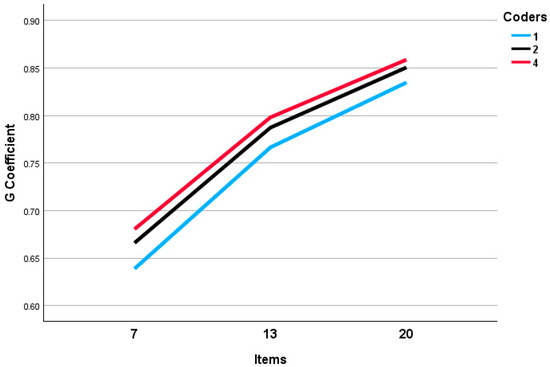 As can be seen from the generalizability analysis in Figure 4, adding additional items beyond 13 increases reliability by about g = 0.01 per item regardless of the number of coders. The estimations provided in Figure 4 assume that each item added is from the same universe of items as the existing ones, and that each added item is equally as reliable. We focused on the chosen phonic elements because they do not require a high degree of inference-making for the teacher to identify, nor are they particularly tedious to code.