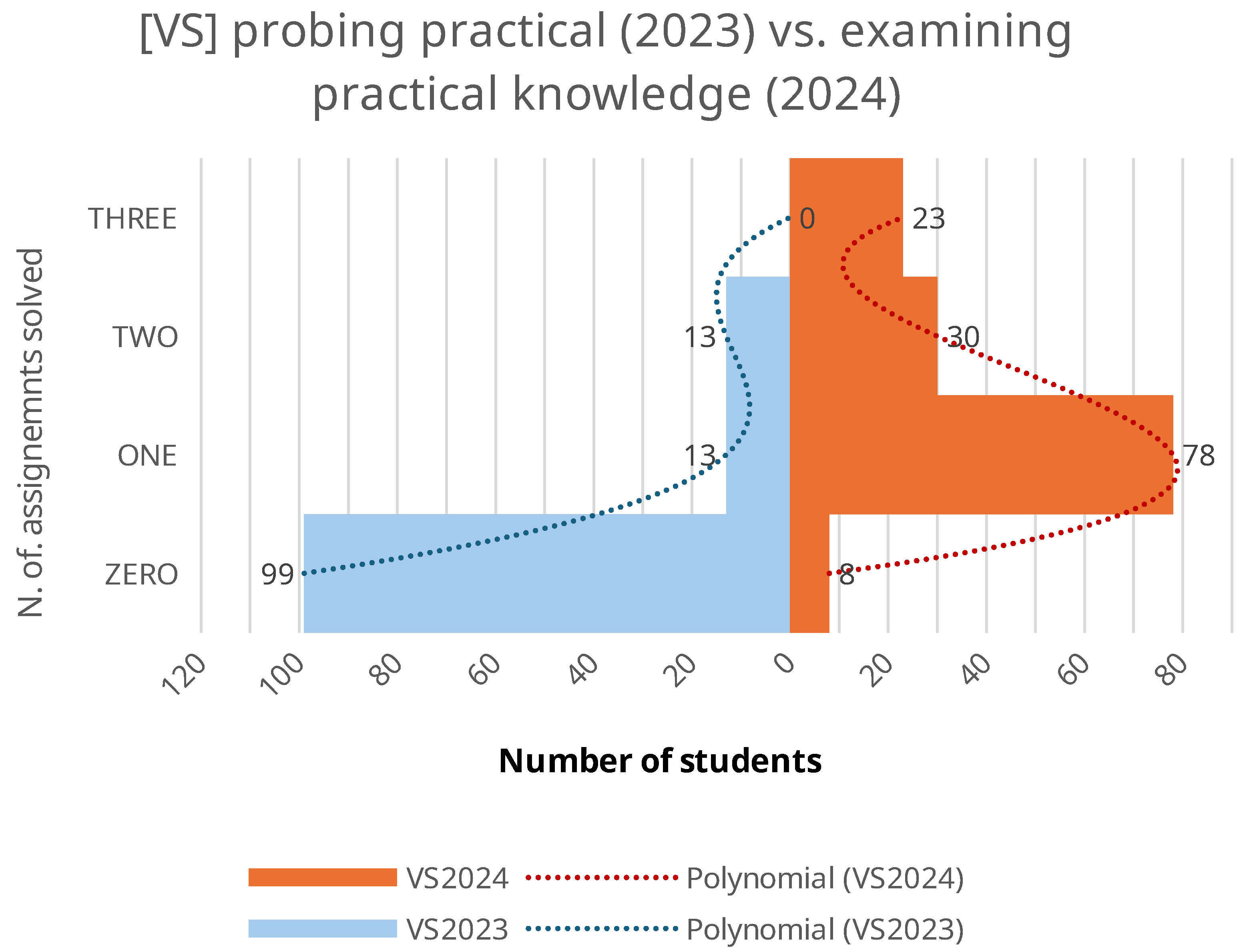 - Written Exam: The main component of the final exam, consisting of 15 multiple-choice questions focused on code analysis (strictly on-paper). The exam had a maximum duration of 50 min. Students scoring more than 50% on this component passed, points achieved at probing exam were added on top in this case.