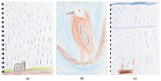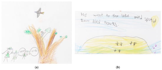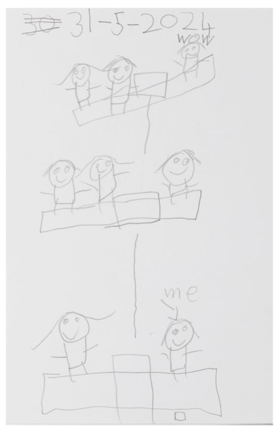 Students also expressed a deep emotional connection to Bush School, including joy and meaning in their journals: “I love Bush School so much.” “Playing on nature. It gave me a good feeling.” “Bush School reminds me of my grannie’s farm,” and drawings (see Figure 4). Adults reinforced this: “I have never seen a child so happy,” “It’s my child’s favorite day.” Quantitative data further confirmed these insights. “Being at Bush School makes me happy” all the time remained high (84% post-intervention, 80% at follow-up; MD = −0.04, p = 1.000). “I like playing in nature at Bush School” all the time rose from 68% to 88%, with increases for boys (MD = 0.45, 95% CI [0.11, 0.79]) and girls (MD = 0.54, 95% CI [0.23, 0.84]). Conversely, “Being at school makes me happy” dropped from 56% to 48% post-intervention, then rebounded to 80% at follow-up (MD = 0.36, p = 0.033), with a stronger effect for girls (MD = 0.54, 95% CI [0.03 to 1.04]).