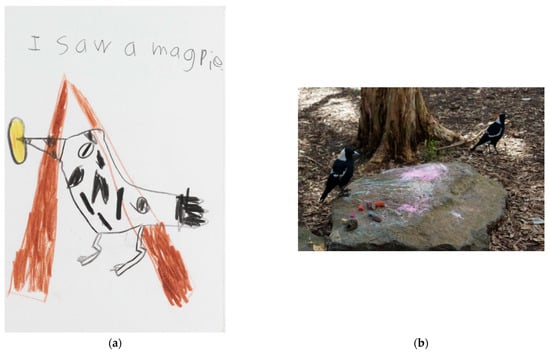 Excerpt from a student journal showing connection to animals. (a) Magpie in front of a cubby that the children had built. Note. Child said the magpie had come to play; (b) Magpies near the chalk/ochre rock. Note. The children shared that the magpies like them and are not scared of them, so they try to join in their play.