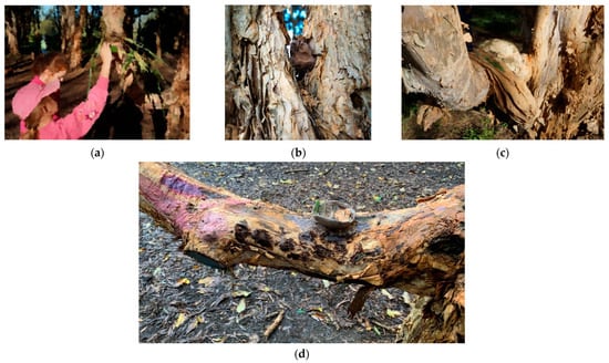 Photos of different presents the children gave to the trees. (a) Children giving trees presents; (b) A clay figurine gift; (c) Paperbark blanket gift; (d) Gift of a clay bowl and decoration. Note: The children asked for the tree’s permission before painting her.