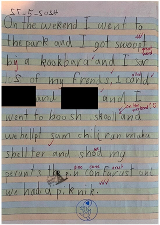Writing outcomes were not a formal focus of the intervention and were not systematically assessed, making it difficult to draw conclusions about causal impact. However, teacher-reported observations during the intervention period suggested that some students showed noticeable changes in writing. One teacher commented, for instance, that a student who “will not do writing, but wrote in his journal about his morning at Bush School.” Another student was observed writing at greater length and with more detail than before participating in Bush School (see Figure 2). While these examples cannot be attributed definitively to the intervention and may partly reflect individual variation or developmental progression, they were significant enough to be spontaneously noted by teachers. Importantly, no slippage in core academic areas (reading, writing, and mathematics) was reported by the teachers during the study. As one teacher reflected, “Leaving for those couple of hours per week and not having… traditional teaching time. They certainly were still learning.”